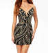 Introducing the Strapless Beaded V-neckline Cocktail Dress by ASHLEYlauren, where elegance meets allure. This strapless mini dress showcases a plunging V-neckline and a striking V-back, adorned with a fully sequin texture in a gold-black color palette. It features an ornate bead pattern, offering a touch of quiet luxury ideal for spring evening events. Crafted with a bodycon silhouette, it promises a flattering fit with a convenient zip closure.