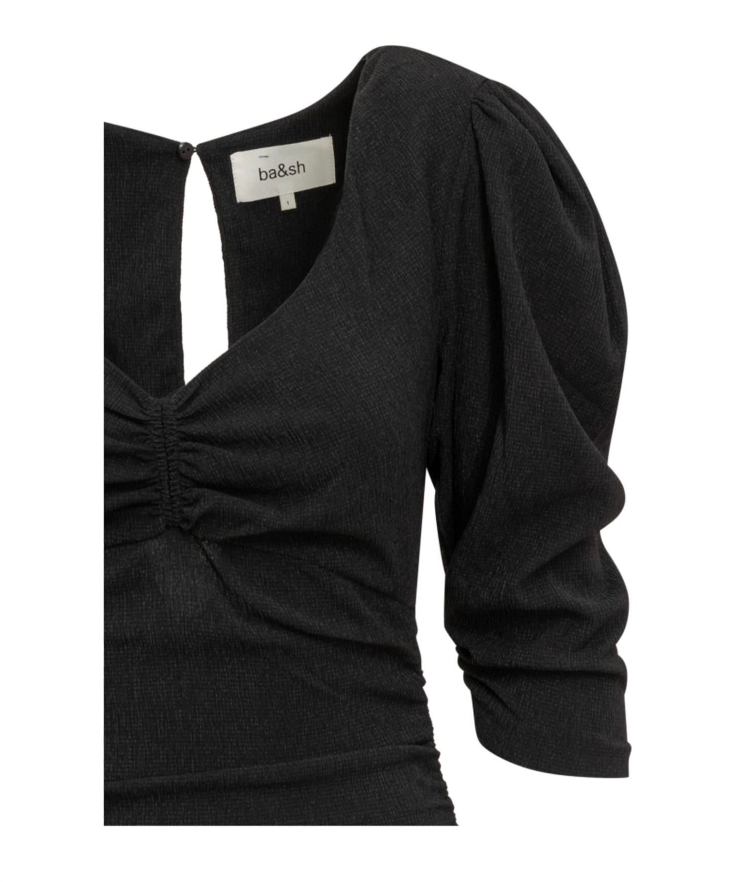 The perfect mini dress for those warmer months. Elevate your wardrobe with the ba&sh Sheath Dress, a must-have addition to any stylish woman's closet. This Parisian-inspired piece exudes joy with its sophisticated design and timeless appeal. The dress features a flattering V-neck, ruched bust, and 3/4-length sleeves, creating a chic and elegant silhouette. Ruched seams add a touch of texture while the keyhole back with button-and-loop closure adds a modern twist. Crafted from 98% polyester and 2% elastane, this dress is both comfortable and luxurious. Hand washable and imported, this dress is perfect for any occasion. Update your look with the ba&sh Sheath Dress and showcase your impeccable sense of style.