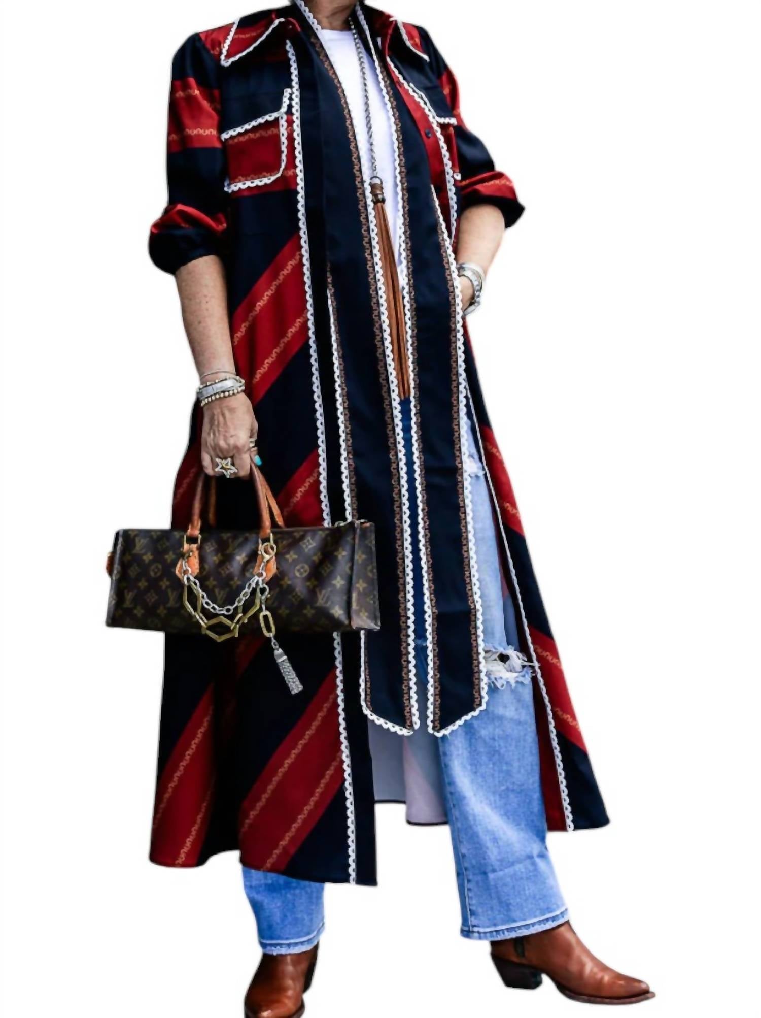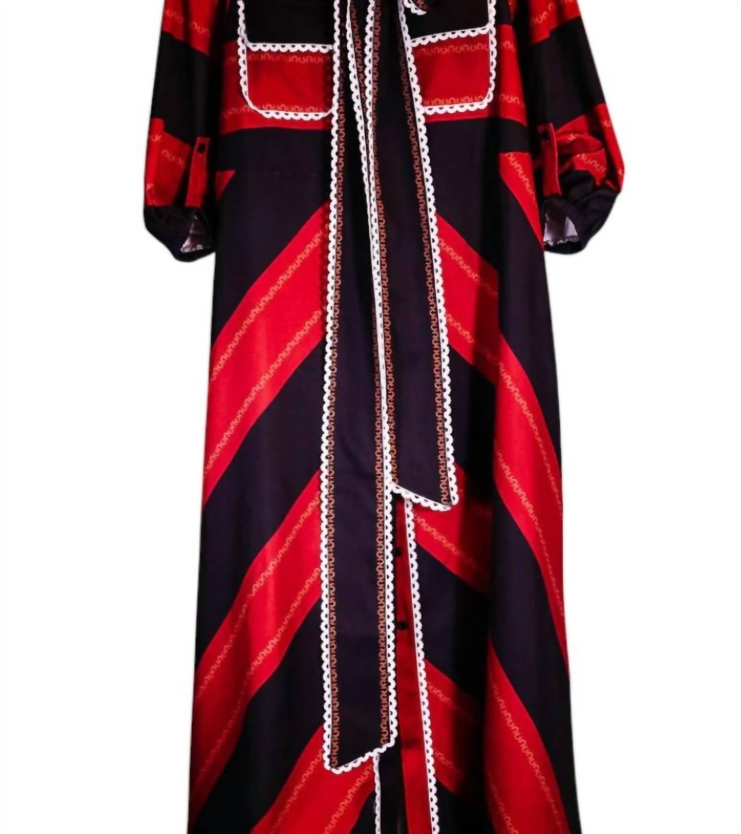 Who doesn't love a good maxi dress? This one you'll be reaching for season after season. Introducing the Rudy Midi Dress by BEULAHSTYLE, a vibrant red masterpiece for your summer wardrobe. Featuring three-quarter sleeves with faux tabs and elastic cuffs, this dress is crafted from 100% polyester, offering a smooth and stylish fit. The dress is designed with a button closure, spread collar, double breast pockets, and a bicolor striped print enhanced by lace trim, ensuring both elegance and practicality. Care instructions: Machine wash and tumble dry.