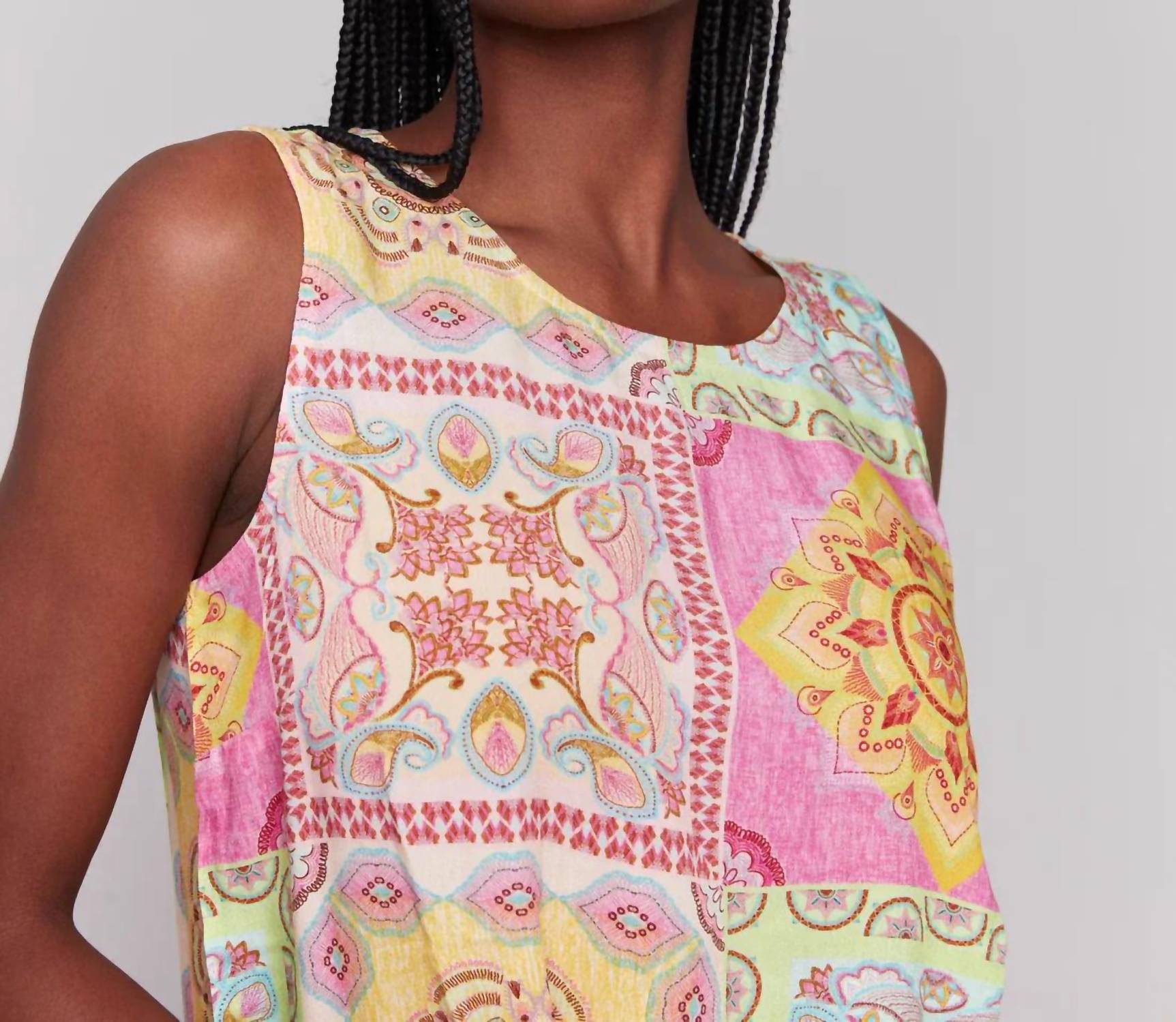 Introducing the Printed Sleeveless Top by CHARLIE B, a chic addition to any wardrobe with its vibrant Carousel color and patterned design. This sleeveless top is crafted from 100% Viscose, ensuring comfort and style throughout the day. It features a keyhole back with a convenient button closure for an elegant touch. The garment has a back length of 24 inches, ideal for versatile styling.
