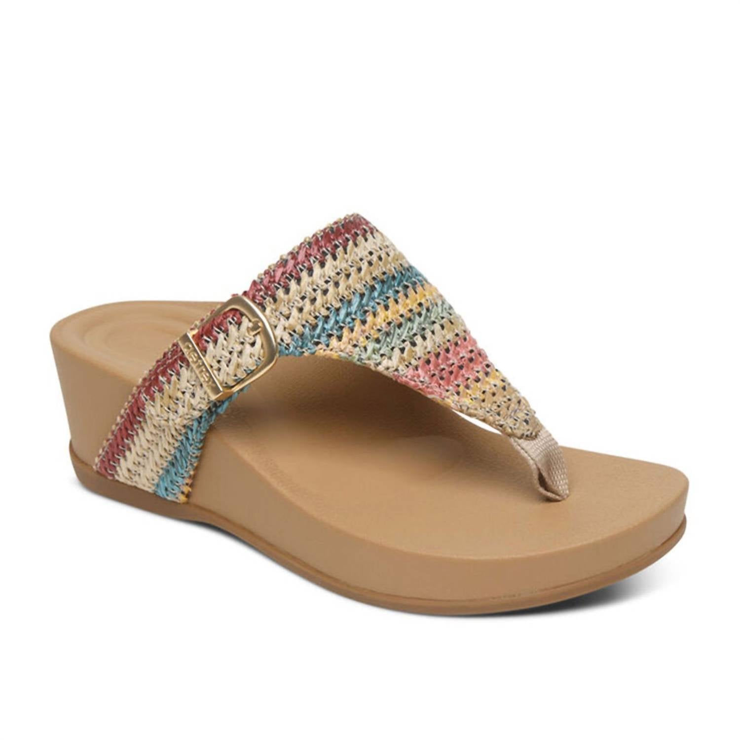 Classicly cute and all-day-wearable. We love this sandal. This sandal features a built-in Aetrex Orthotic for added support, a fully adjustable quarter strap wedge, and a hook-and-loop closure for a customizable fit. The padded heel provides extra cushioning, while the bunion pocket ensures comfort. It also features a cork-wrapped 2 ¾" wedge and a lightweight UltraSky™ EVA foam midsole for long-lasting comfort.