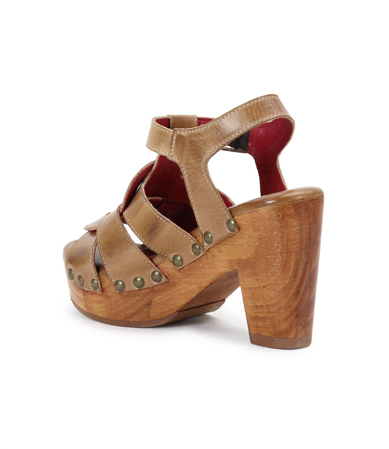 Experience boho chic style with the Women's Caitlin II Sandals by BEDSTU, perfect for your next vacation. These sandals boast a leather upper with a distressed look, visible stitching, and brass stud details. A wooden platform heel elevates the overall design, with an adjustable buckle ankle strap for a secure fit. Featuring a t-strap design and an open toe, they come with a striking red insole lining. Heel height: 4 inches.