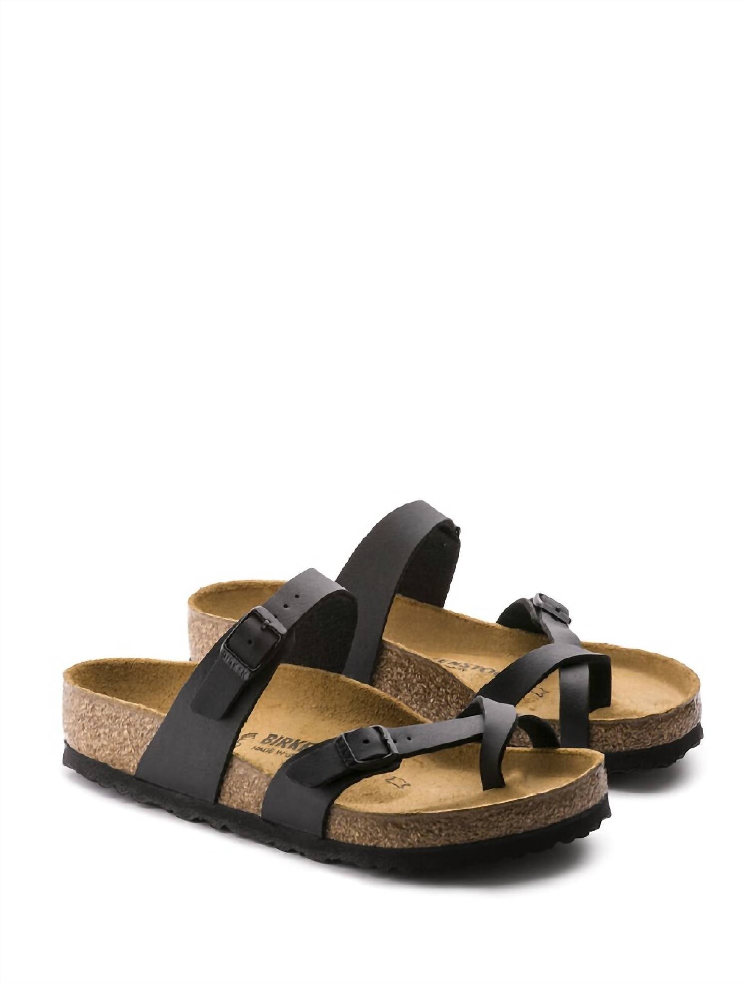 THE MAYARI FROM BIRKENSTOCK - AN ELEGANTLY COMFORTABLE SANDAL WITH ADJUSTABLE, CRISSCROSSING STRAPS THAT FORM A SINGLE LOOP AROUND THE TOE. CLASSIC SUPPORT AND ADJUSTABILITY, DESIGNED BEAUTIFULLY. SHOWN IN BIRKO-FLOR®.