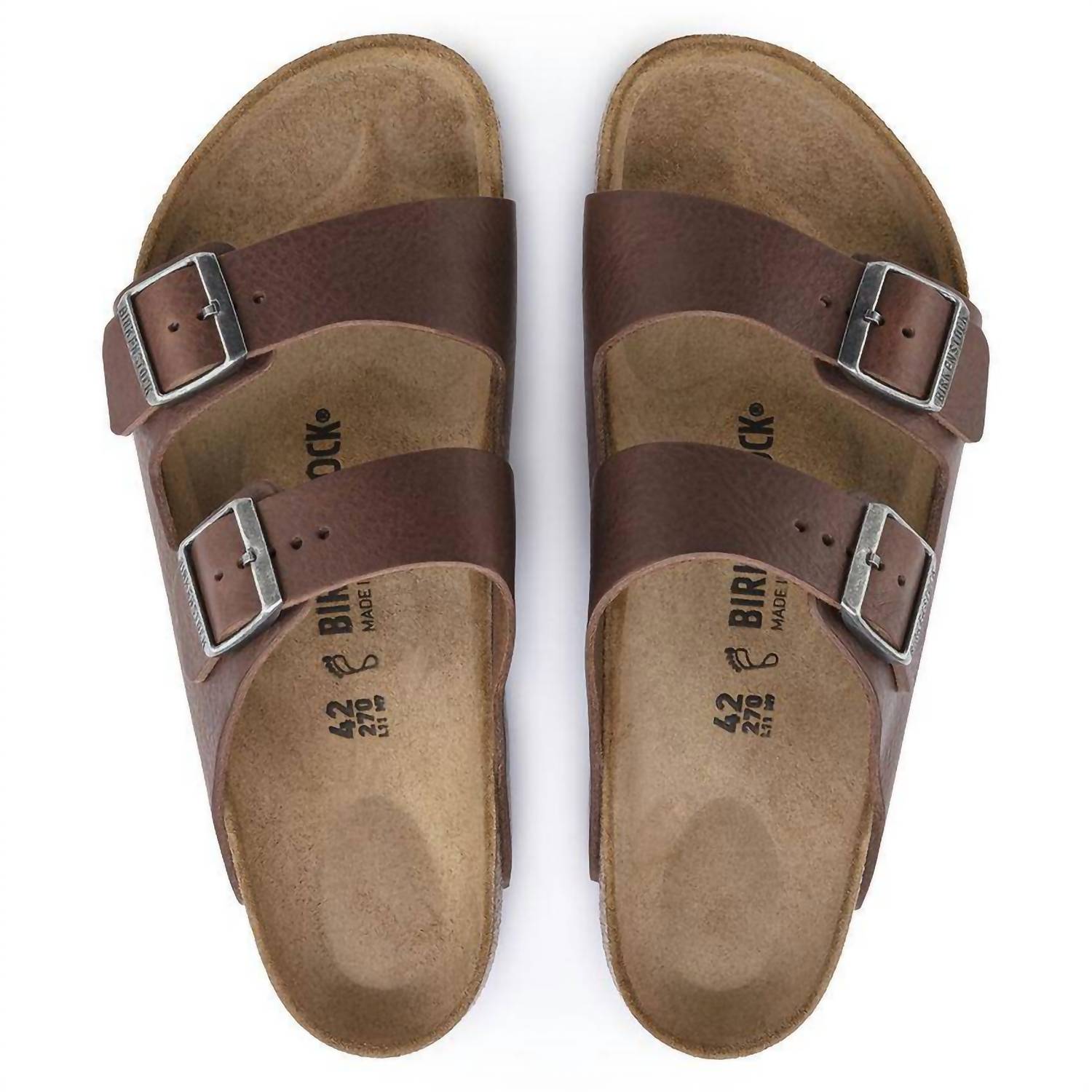 Elevate your summer style with the Men's Arizona Roast Hard Foot Bed Sandal by BIRKENSTOCK in Vintage Wood. Crafted with a natural leather upper and lined with suede, these sandals promise durability and comfort. They feature an anatomically shaped cork-latex footbed and a lightweight EVA sole, complemented by two straps with individually adjustable metal pin buckles. Made in Germany, these flat sandals are an ideal minimalist choice for vacation occasions.
