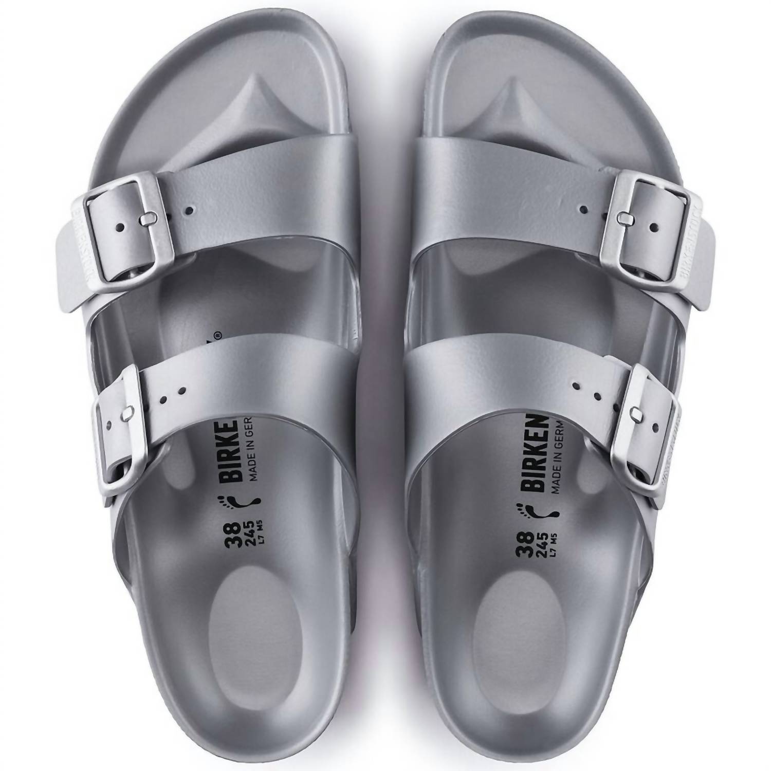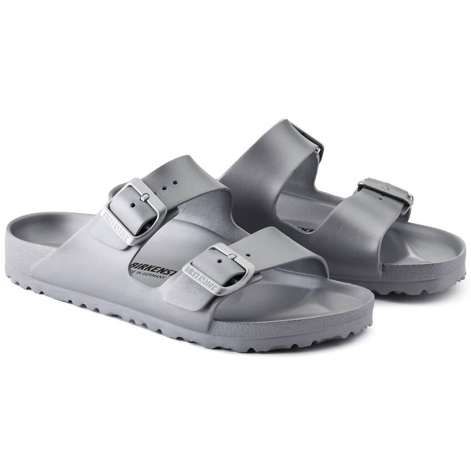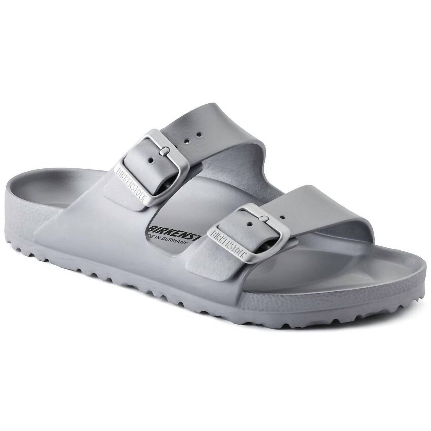 Discover the Unisex Arizona Eva Sandals by BIRKENSTOCK in striking silver, designed for unmatched comfort and versatility. Featuring the legendary two-strap design with individually adjustable pin buckles, these sandals are crafted from ultra lightweight and highly flexible EVA that is both waterproof and skin-friendly. With an anatomically shaped footbed and open toe, they cater to a medium width and provide shock absorption and washability. Proudly made in Germany, they promise excellent support with a flat heel, ideal for various occasions including the beach, garden, or post-gym relaxation.