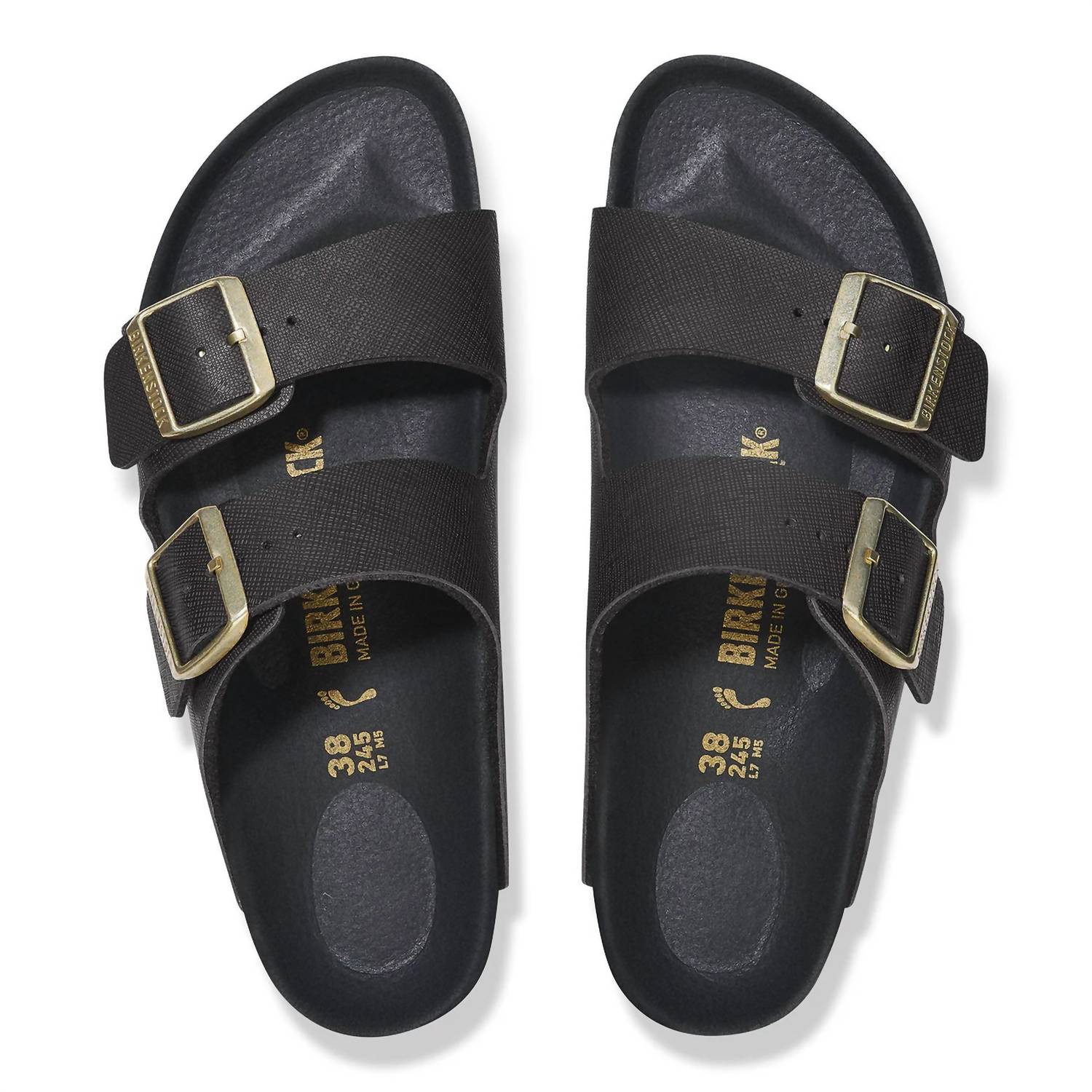 This sandal will take you from brunch to dinner and everything in between. Discover the timeless style of the Women's Arizona Birko Sandal by BIRKENSTOCK, a staple since 1973. Crafted in Germany, this sandal features a durable Birko-Flor® faux leather upper, adjustable straps with metal pin buckles, and an open toe design. Its contoured cork-latex footbed is lined with suede for unparalleled comfort and support, while the flexible EVA sole keeps it lightweight. Ideal for summer streetwear or vacation, these black sandals come with a narrow fit and a flat heel (1" & under).