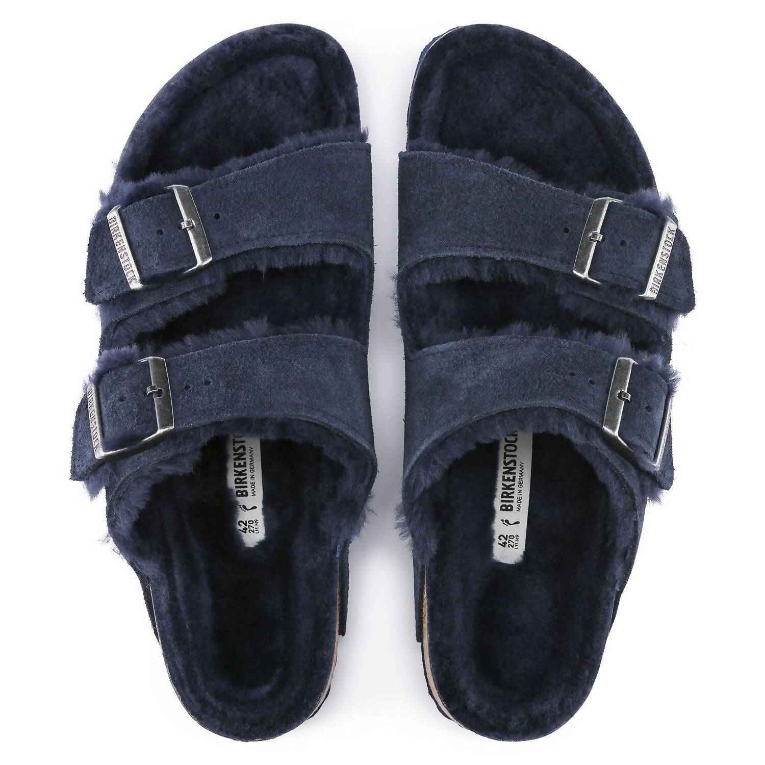 Flowy dresses, cropped pants, and even jumpsuits... this sandal works with them all! Embrace comfort and style with the Women's Arizona Fur Shearling Sandal by BIRKENSTOCK, crafted in Germany for a winter-ready wardrobe. Featuring an open toe design and flat heel, this midnight-colored sandal is made with high-quality suede and genuine shearling lining for extra coziness. The anatomically shaped cork-latex footbed and EVA sole offer unparalleled support, while two adjustable lambswool-lined straps with metal pin buckles ensure a personalized fit. Ideal for streetwear or vacation settings, these sandals cater to a medium shoe width.