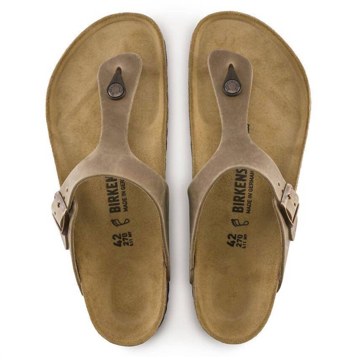 Discover the Women's Gizeh Leather Thong Sandal by BIRKENSTOCK, a vacation-ready choice in a Tobacco color perfect for summer. The sandal is crafted with an oiled leather upper and features an anatomically shaped original BIRKENSTOCK soft footbed lined with suede for maximum comfort. Its EVA sole ensures durability while the open toe and flat heel design provide a minimalist yet modern look. Complete with a metal tongue buckle for a personalized fit, this sandal is proudly made in Germany.