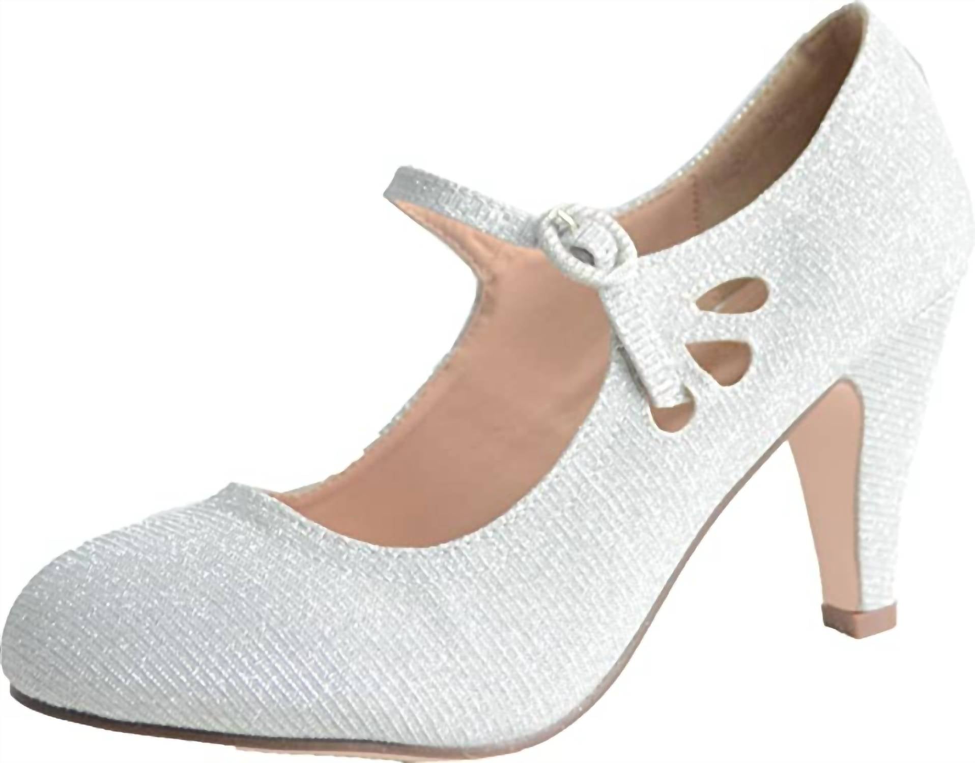 This sandal will take you from brunch to dinner and everything in between. Step out in style with the Women's Kimmy Rounded Toe Slip On Sandals by CHASE + CHLOE, designed to bring a touch of Quiet Luxury to your summer wardrobe. These silver glitter sandals feature a chic closed round toe and an adjustable Mary Jane strap, all crafted from durable synthetic material. The exquisite laser-cut teardrop design adds an elegant touch, while the synthetic sole ensures comfort with a high cone heel for a fashionable lift. These imported sandals are perfect for elevating your Thanksgiving or engagement outfit with all-day comfort.