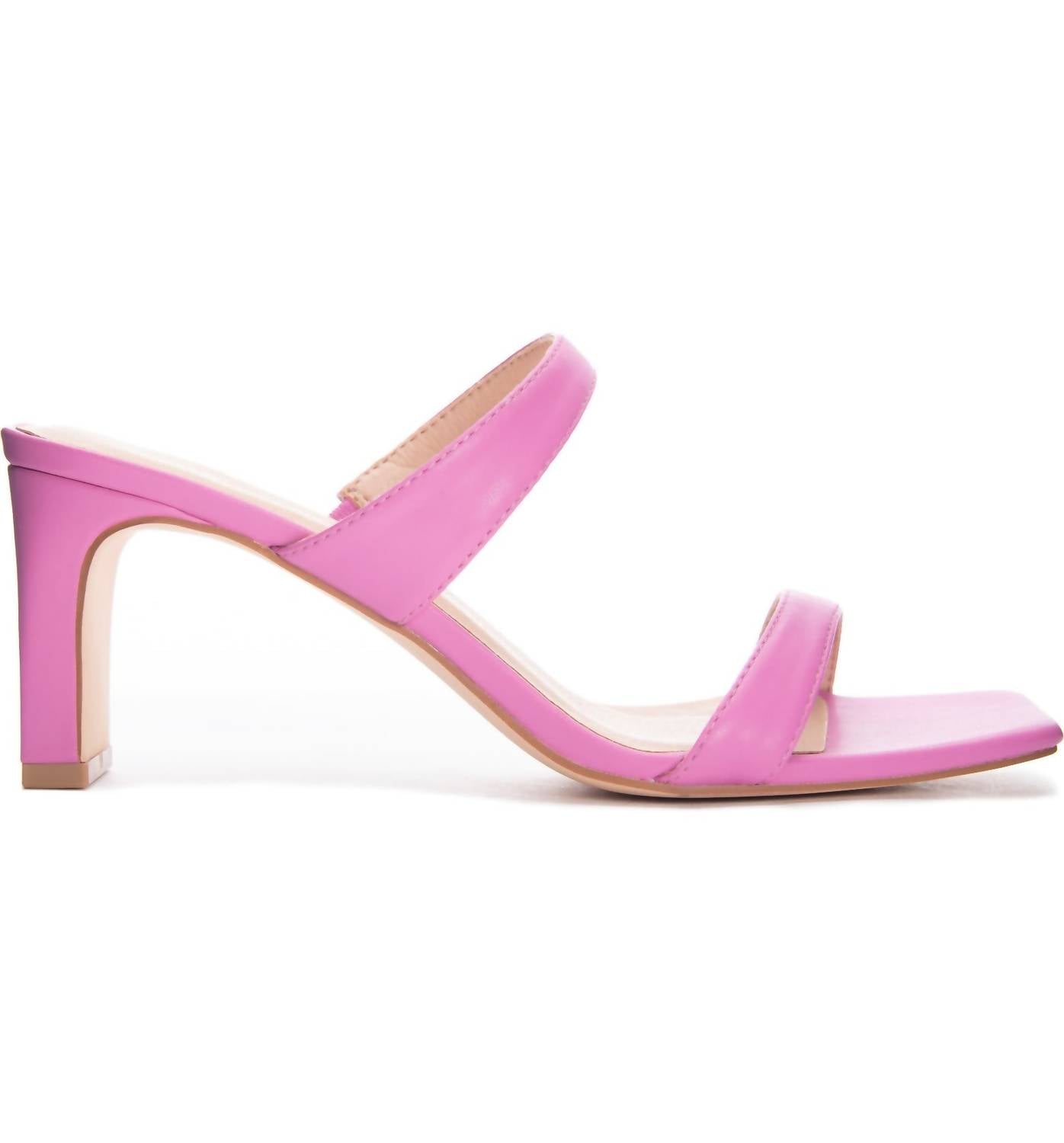 Open square toe with two thin straps across the quarter and vampSynthetic upper, lining and soleMaterials: Synthetic leather Measurements: 3" approximately