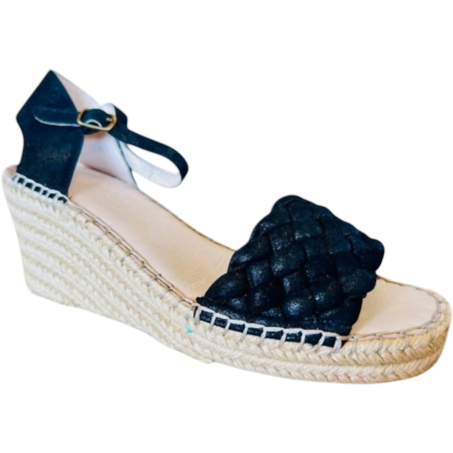Flowy dresses, cropped pants, and even jumpsuits... this sandal works with them all! Step into effortless elegance, perfect for any boho chic occasion. Mid-height wedge sandals showcase a black shimmer leather upper complemented by an espadrille-style platform uniquely crafted from rope or jute. Detailed with braided forefoot straps and an adjustable ankle strap with a buckle fastening, offer style and comfort. Designed with visible stitching, open-toe wedges are a must-have for spring gatherings.
