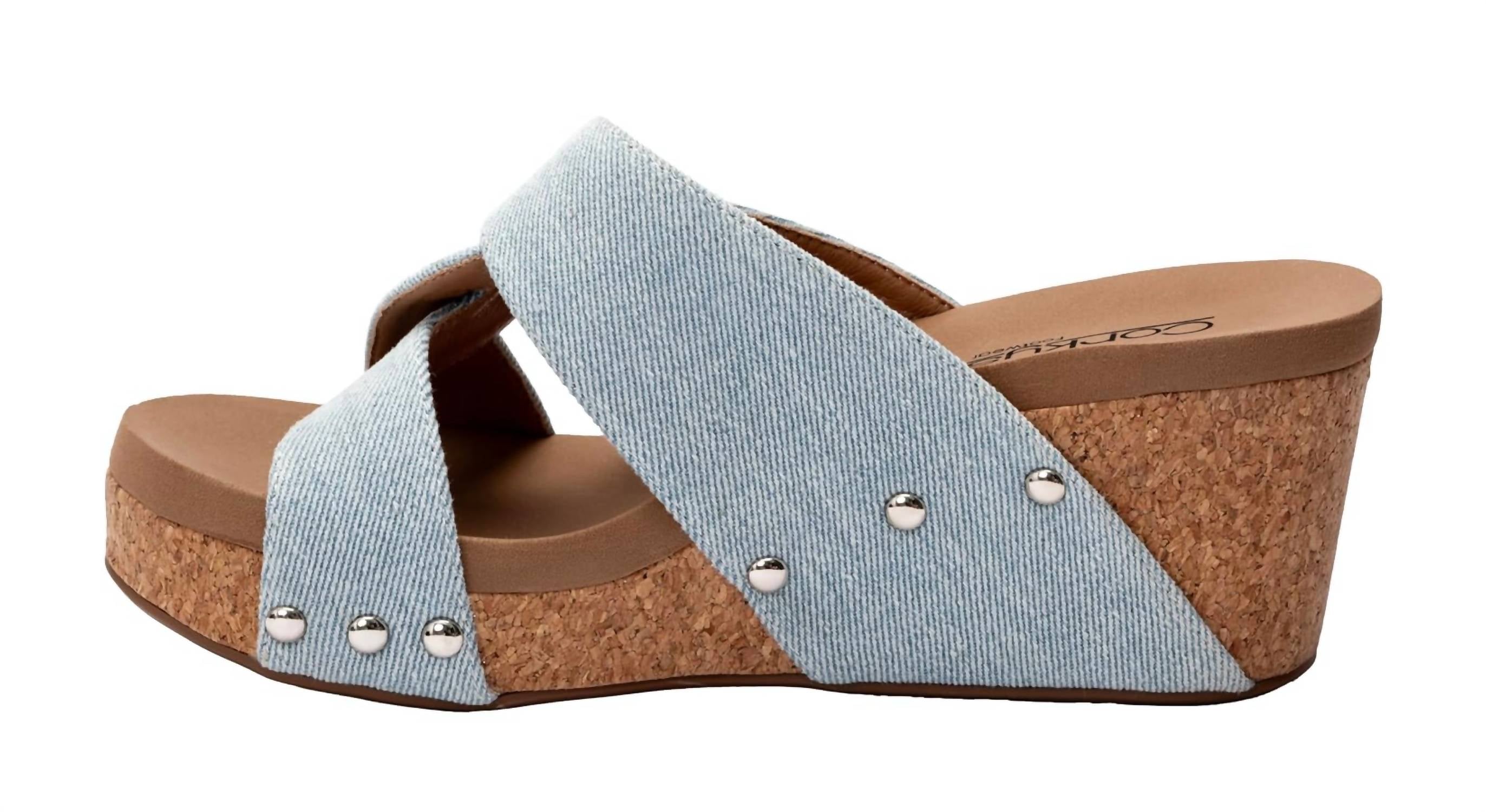 Step into summer with the Bonny Denim Wedge Sandal by Corkys Footwear, your ultimate seasonal companion. Crafted from light blue denim, this sandal features a stylish wedge heel with a comfortable 2.5-inch height, embodying the Boho Chic trend. Perfect for holidays or a casual outing, the round toe design offers a relaxed fit. Ideal for beach days or a Valentine's Day celebration, this versatile sandal ensures light and easy wearability all summer long.