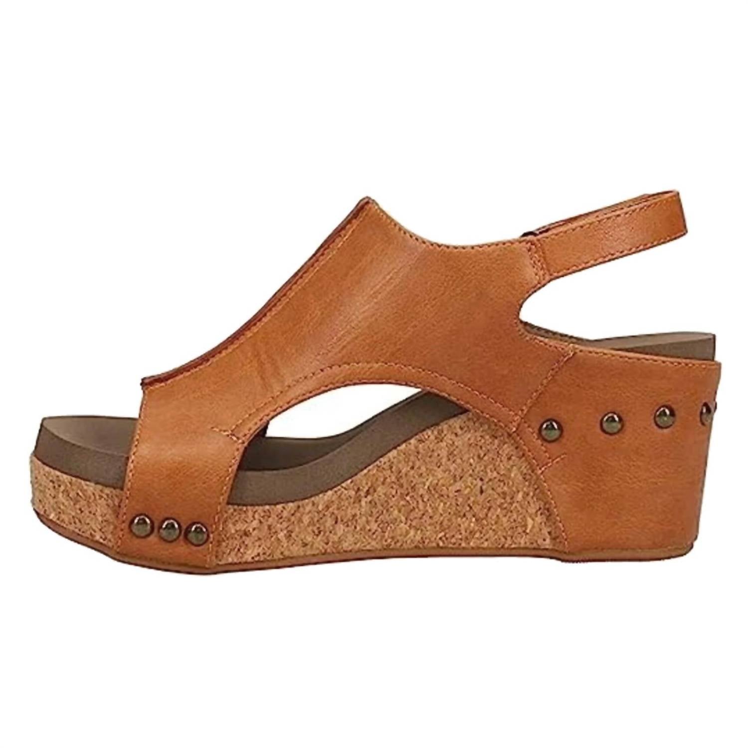 Elevate your footwear game with these adorable wedges. Step into summer style with the Carley Smooth Sandals by Corkys Footwear in a chic Cognac shade. These wedges feature a faux leather upper with a full coverage design, side cut outs, and a center butt seam, complemented by stud details for a boho chic flair. Designed for comfort, they offer a 1-inch platform and a 3-inch wedge heel with a round open toe and a secure hook and loop slingback strap closure. The rubber sole ensures durability, while the sandals fit true to size, making them your perfect partner for dinner parties and Valentine's Day occasions.