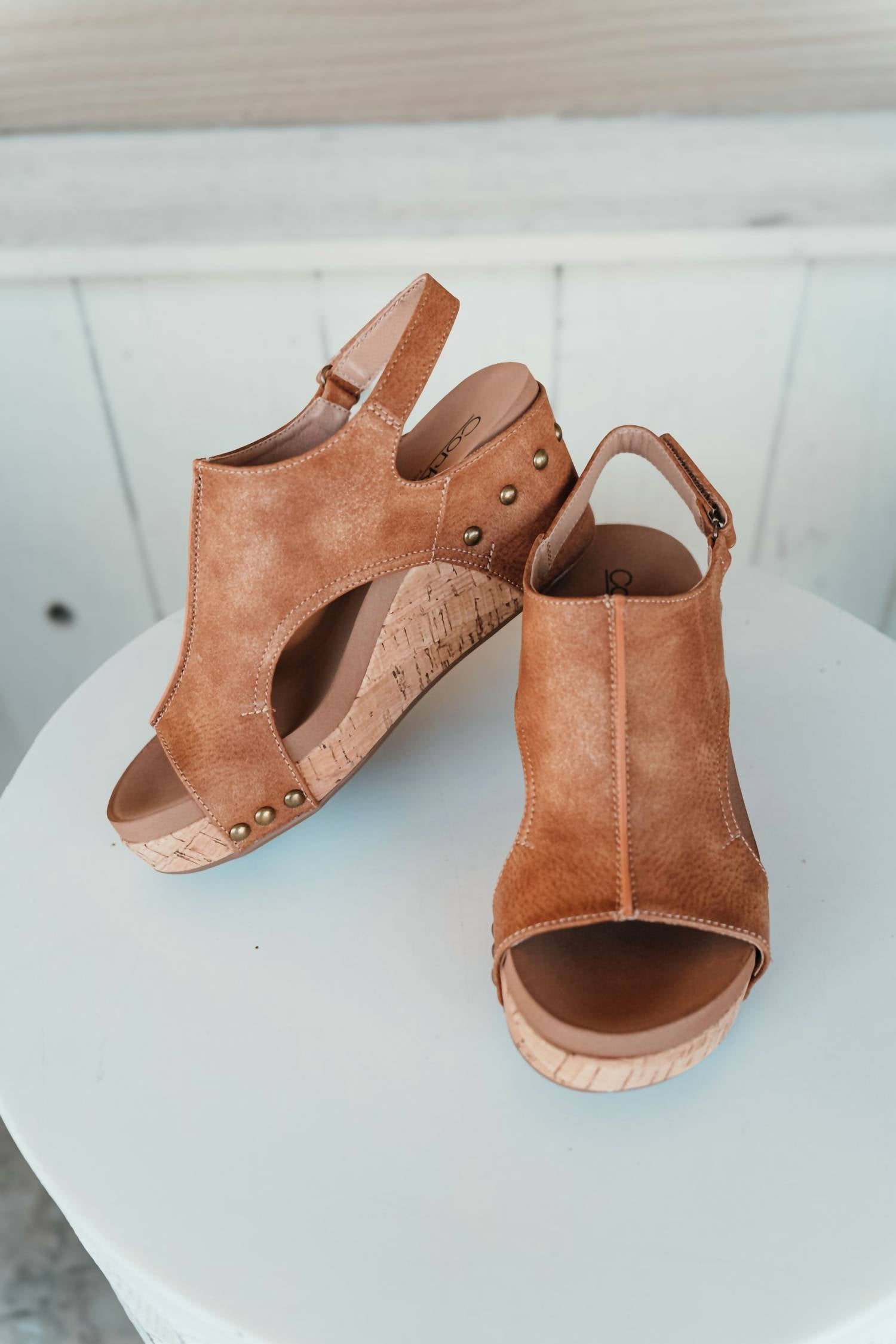 This sandal will take you from brunch to dinner and everything in between. Step out in style with Corkys Footwear Carley Washed Metallic Sandals, a must-have addition to your footwear collection. Featuring an open toe design and an ankle strap, these sandals are perfect for keeping your feet breezy and secure. Crafted from quality cork material, they boast a 2.5-inch cork wedge heel, offering both height and a lightweight feel for all-day comfort. Complete with Corkys Soft EVA Memory Foam Insoles, they ensure durability and comfort, making them ideal for summer dinner parties or 4th of July celebrations.