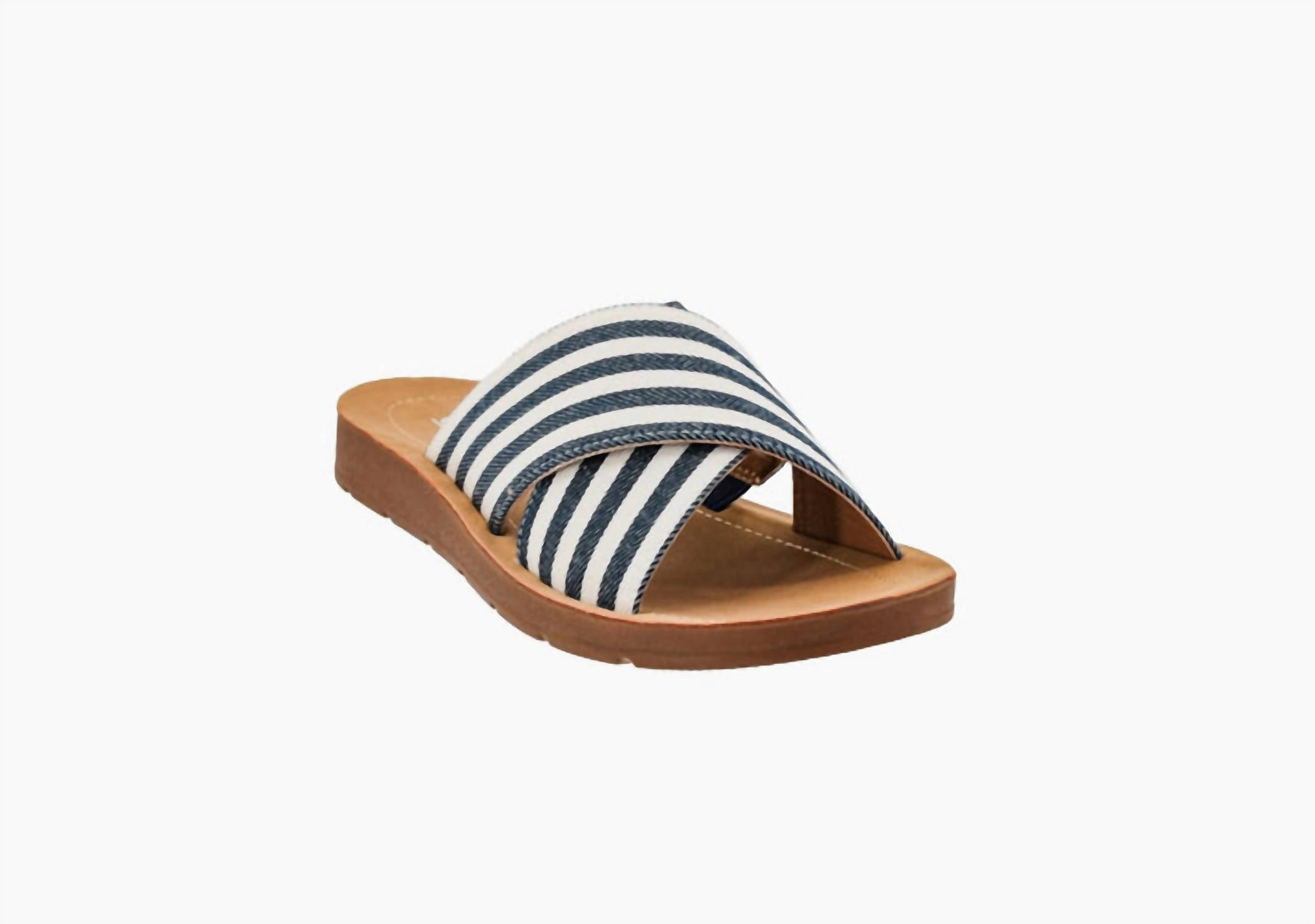 Flowy dresses, cropped pants, and even jumpsuits... this sandal works with them all! Step into summer with the Corkys Footwear Women's Dig It Sandals, perfect for a boho chic look. These navy striped sandals, crafted from durable rubber, feature a flat heel and a round toe shape, ensuring comfort and style. Ideal for housewarming gatherings or celebrating Hanukkah, these slide-on sandals offer versatility for all your summertime adventures. Embrace casual elegance with these vibrant sandals designed to add a pop of color to any outfit.