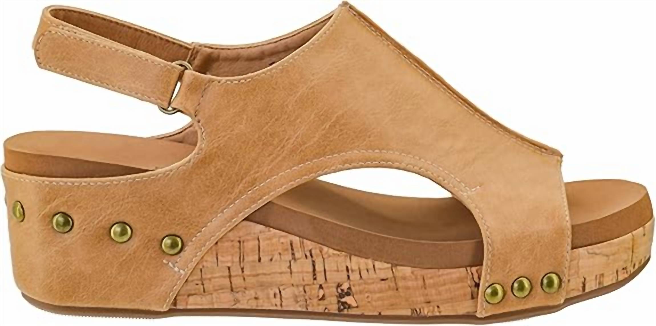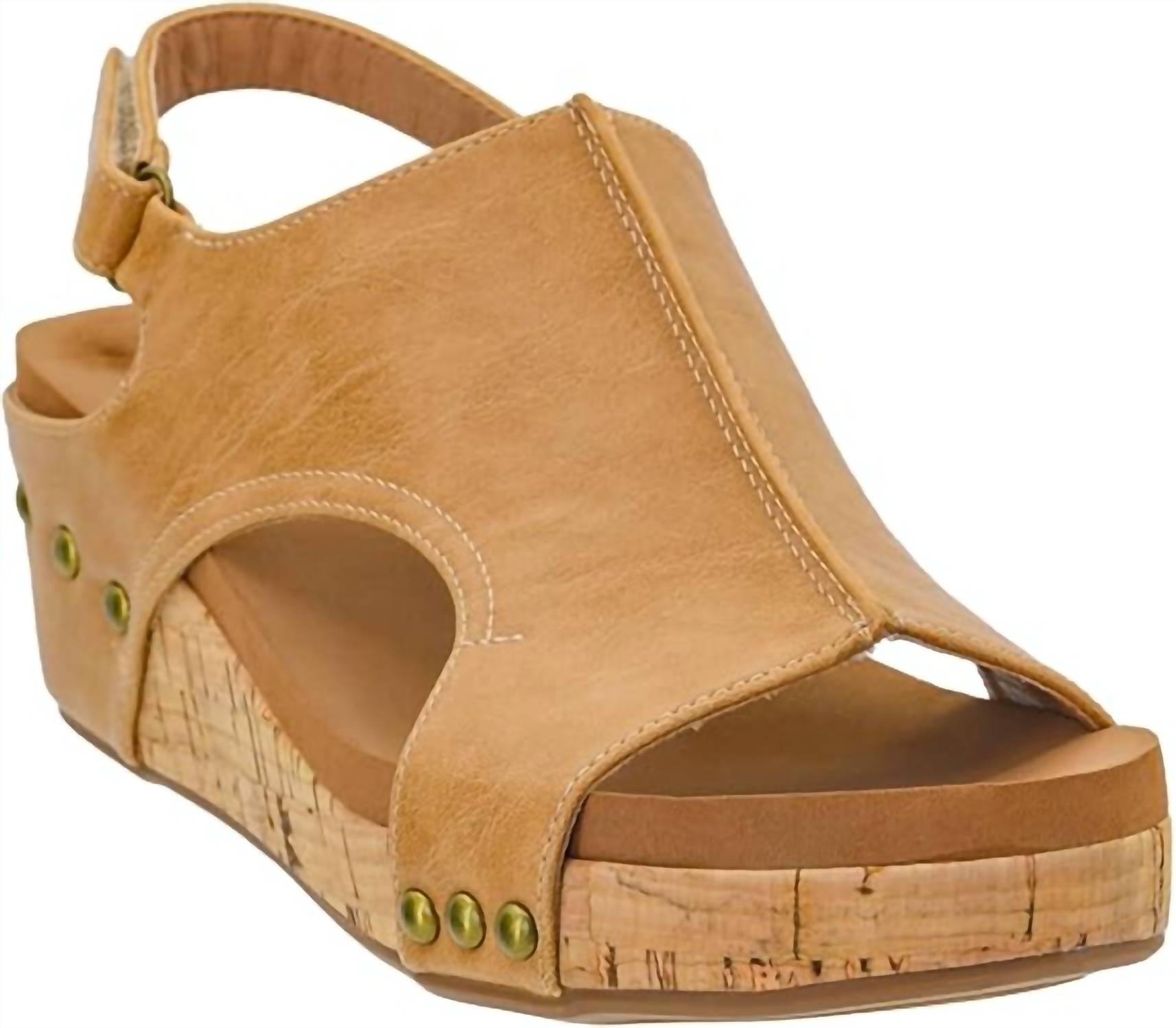 Meet the Women's Volta Smooth Sandals by Corkys Footwear, designed for style and comfort in a stunning caramel hue. These leather sandals flaunt studded accents and feature an open toe with a mid-height wedge heel, perfect for your spring gatherings or Easter celebrations. Closure: Velcro strap for easy wear. Step out in confidence with these true-to-size sandals, boasting a soft cushion bed for all-day comfort.