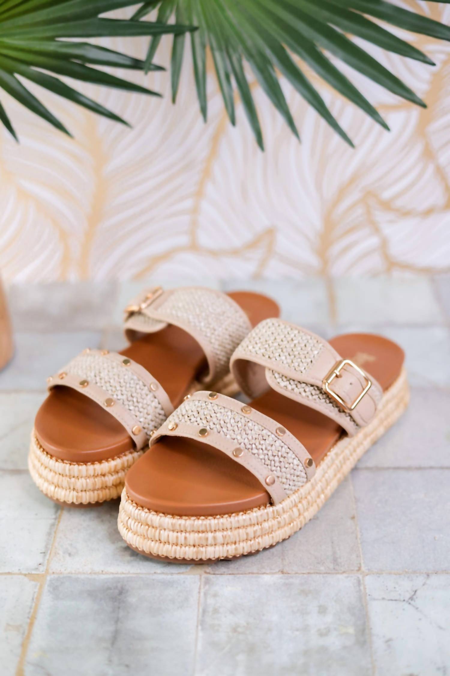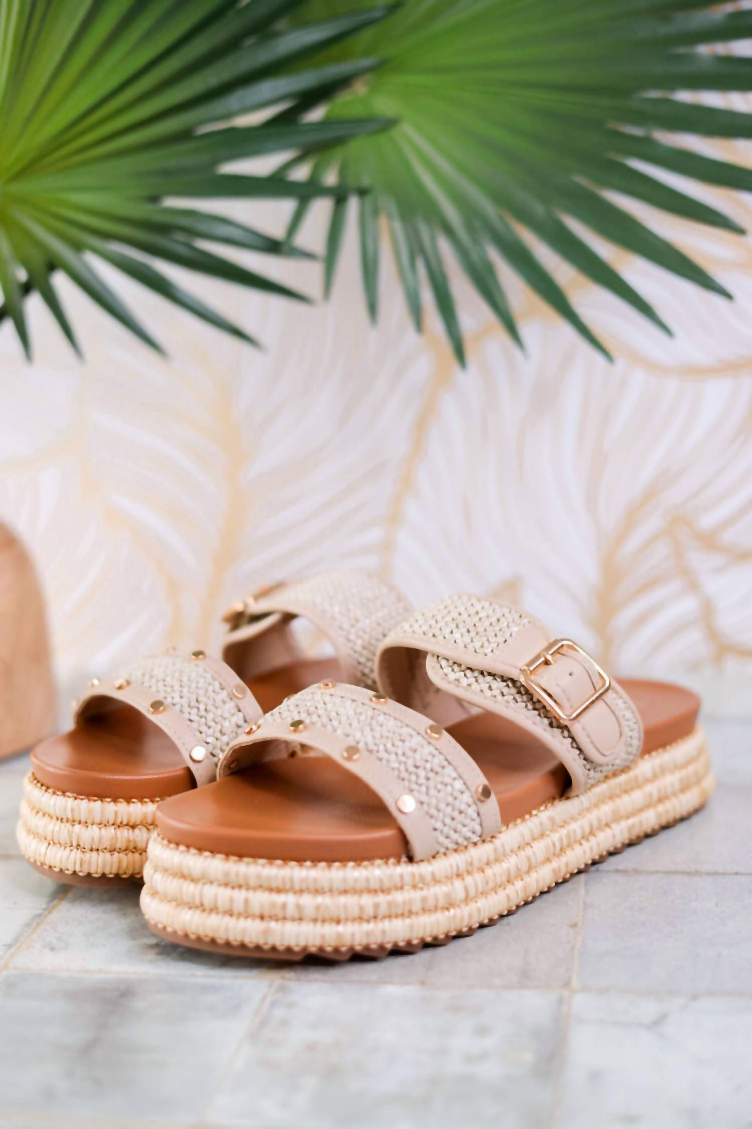 Classicly cute and all-day-wearable. We love this sandal. Step into effortless style with the Women's Walk Of Shame Raffia Sandals by Corkys Footwear. These beige sandals showcase an open toe design and a chic 1.5-inch wedge heel, wrapped elegantly in raffia for a natural appeal. Featuring two woven straps complete with stunning stud and buckle embellishments, these sandals offer both comfort and elegance with their cushioned insoles. With a medium width fit, they're perfect for both casual and dressy occasions, elevating any ensemble seamlessly.