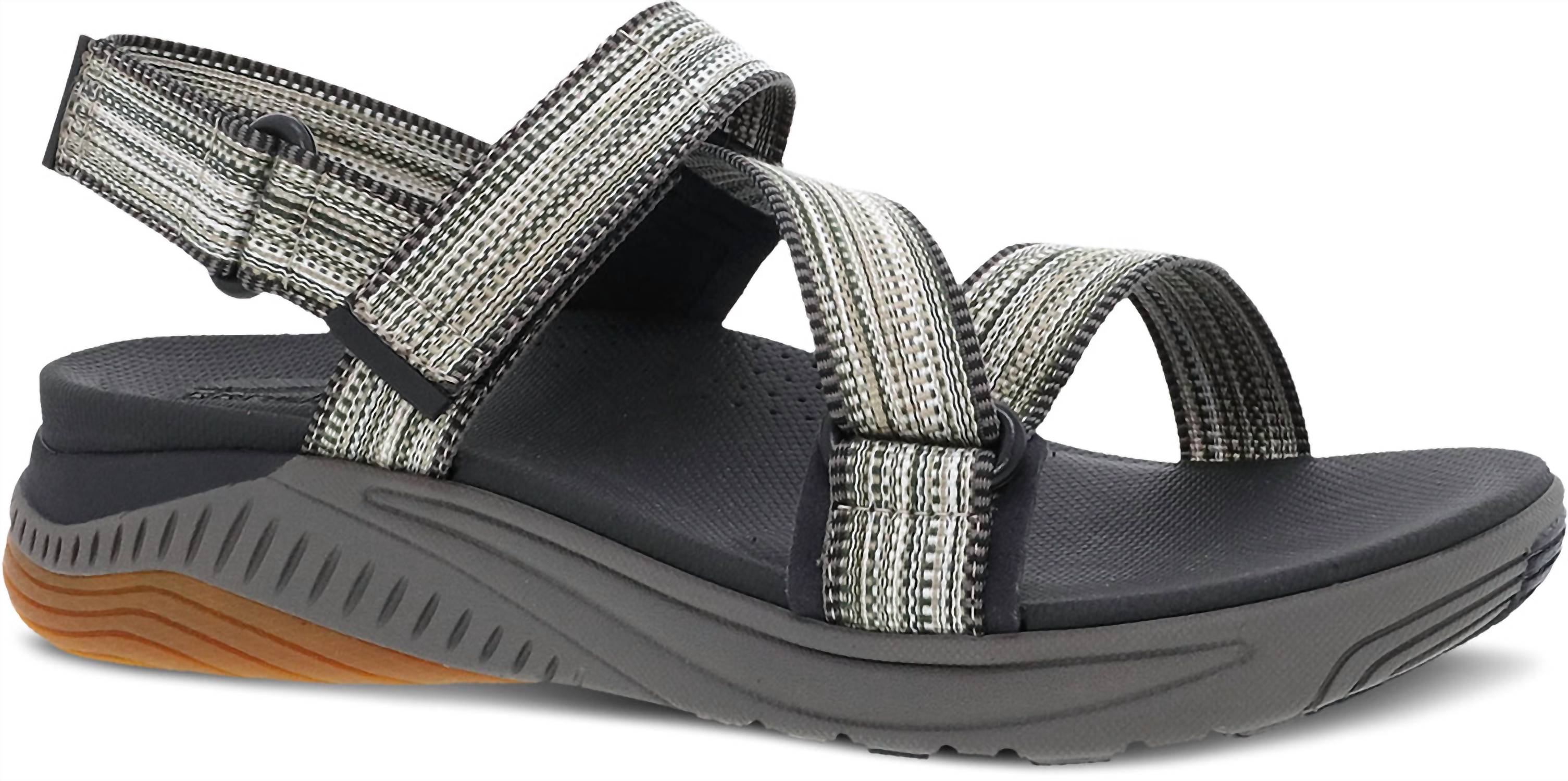 Meet the Women's Rayna Performance Sandal by Dansko, a summer essential for stylish, casual outings. This black sandal features multiple points of adjustability and recycled webbings for an eco-friendly touch. Enjoy superior comfort with the Energy return EVA footbed enhanced by Dansko Natural Arch® technology, and experience durability with its super lightweight EVA midsole paired with a high abrasion rubber outsole. Designed with an open toe and flat heel, this sandal is perfect for church or any summer event.