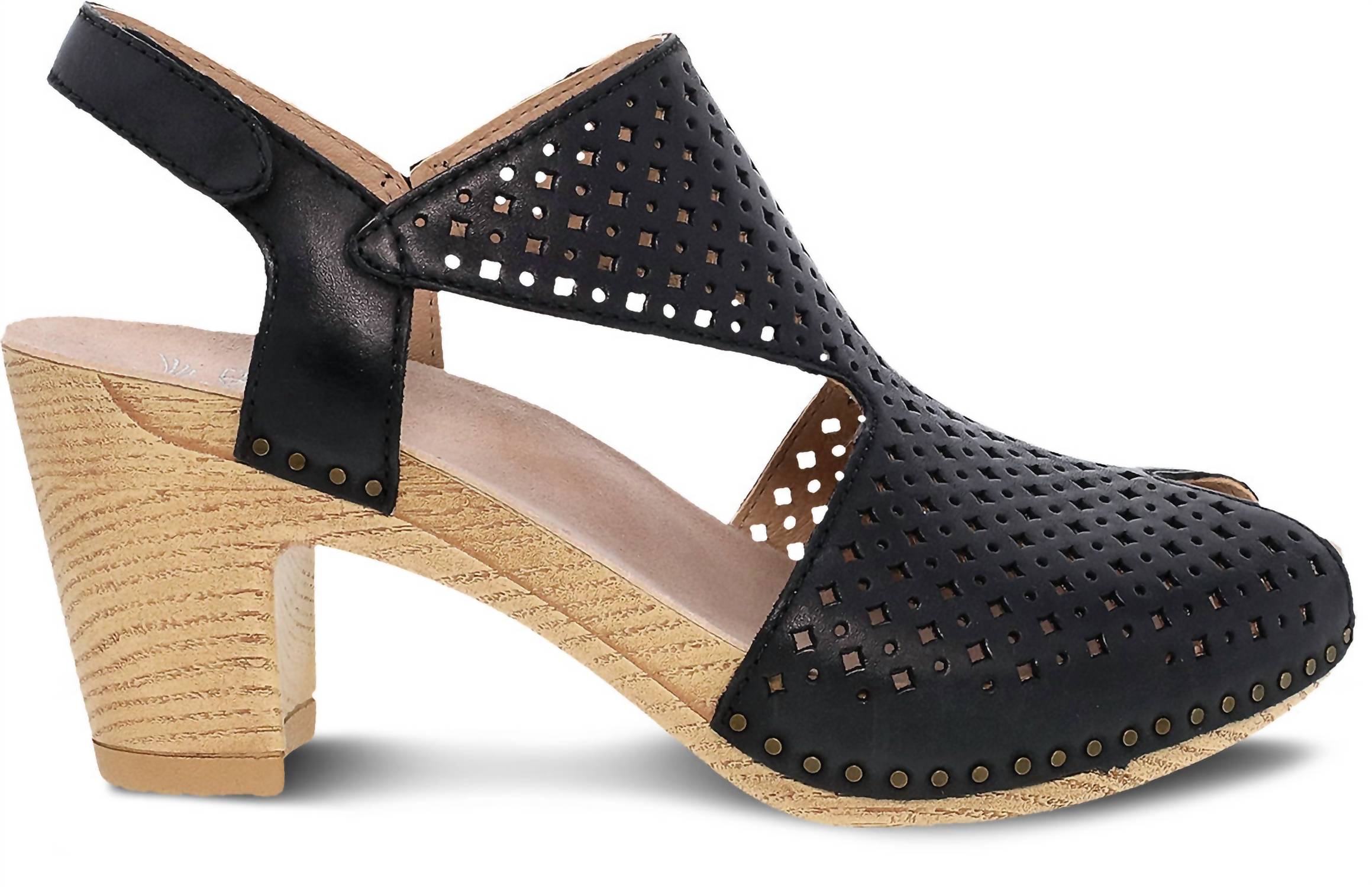 Unique creative design. Heeled slingback. Nail head construction. High-quality leather upper with Nubuck treated with 3M Scotchgard for stain resistance. Chrome-free leather lining for breathability. Chrome-free suede sock lining for a soft underfoot experience. Cushioned energy-return PU footbed. Lightweight PU outsole. Hook & loop adjustability.