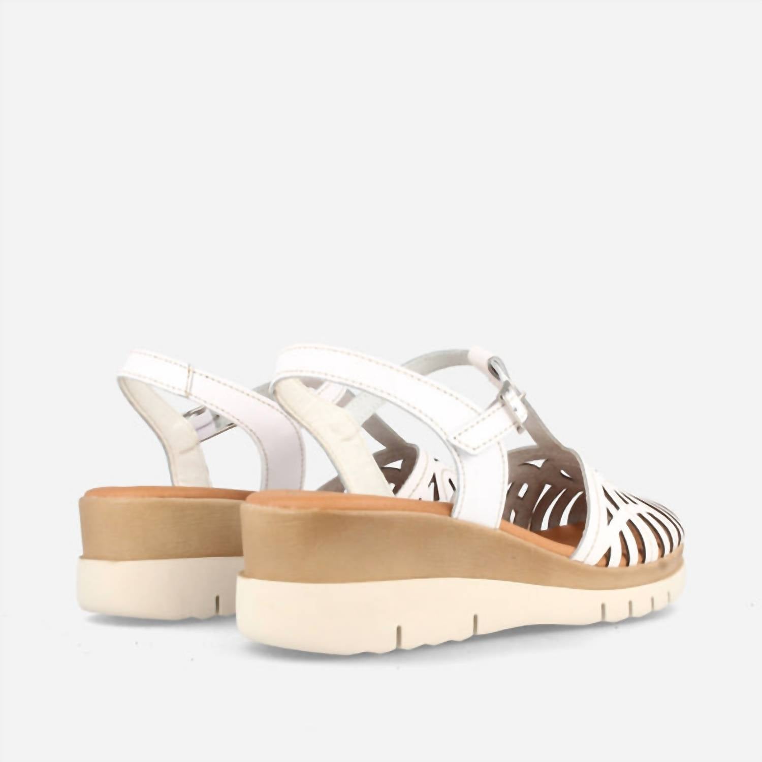 Dresses, denim, shorts... these wedges go with just about anything. The Eric Michael® Rose Sandals in tan offer a chic and versatile option for beach days or Thanksgiving gatherings. Crafted in Spain, they feature a two-tone strappy leather upper with an elegant laser-cut design, complemented by a synthetic footbed for ultimate comfort. With a practical hook-and-loop strap closure and a wedge heel measuring 2 inches, these sandals are perfect for summer outings. Closure: Hook-and-loop. Measurements: Heel Height: 2 inches, Platform Height: 1 inch, Weight: 9 oz. Designed for women, these sandals embody a boho chic trend and are suitable for everyday wear.
