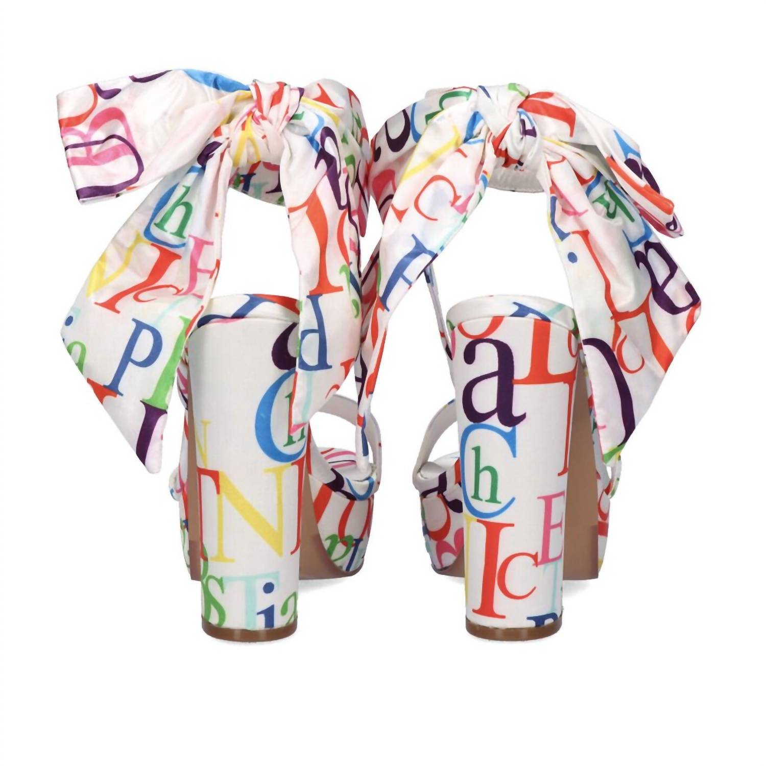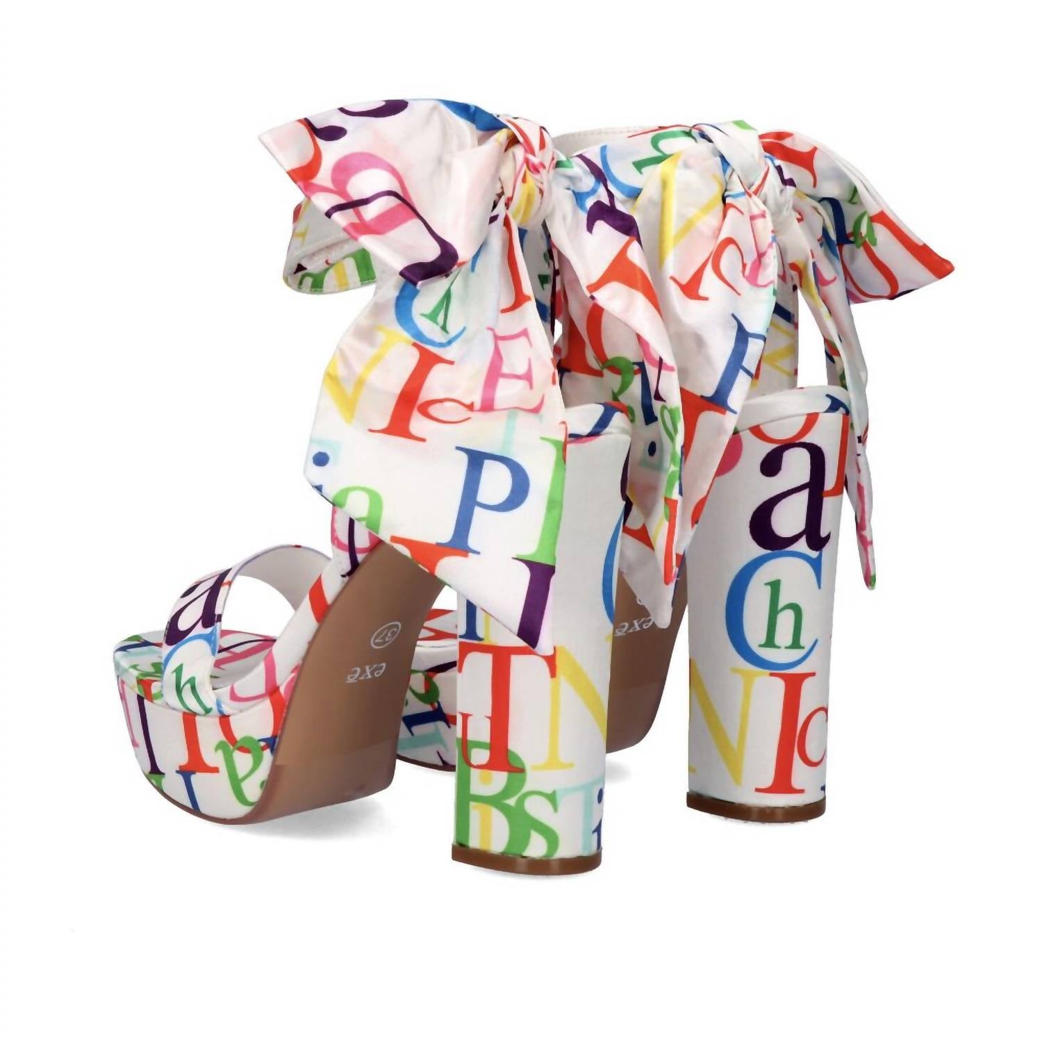 Pair these beauties with your favorite skinny jeans or dress for a night out on the town. Introducing the Ophelia 722 High Heel Sandal by Exe, a striking choice for cocktail parties and spring occasions. This women's platform sandal boasts a colorful print on a white base, with a faux leather cut and synthetic sole for durable wear. With a striking 12 cm heel and a 4 cm platform, it delivers both elevation and comfort, complemented by a stylish decorative bow at the ankle. Designed with an open toe, this maximalist trend staple is perfect for women indulging in elevated footwear with flair.