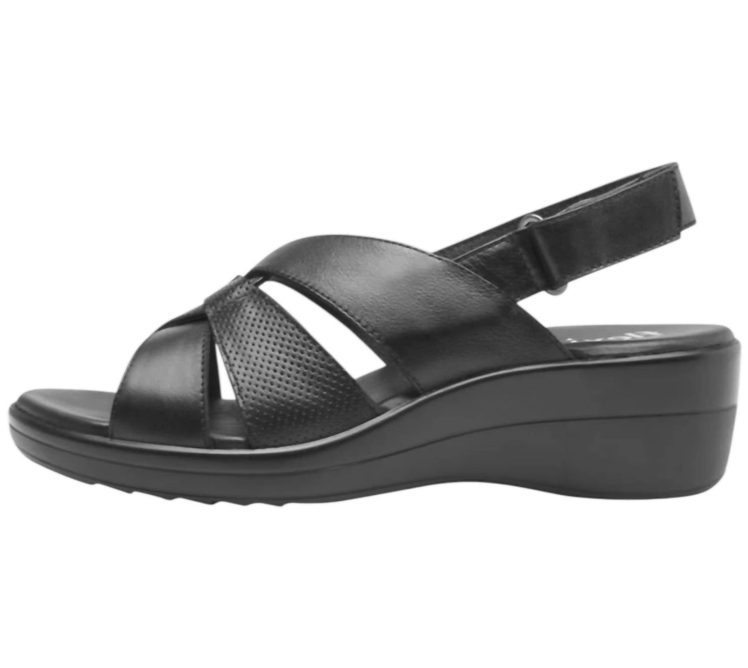 This sandal will take you from brunch to dinner and everything in between. Step into comfort and style with the Women's Leather Slingback Sandals by Flexi, designed with a chic wedge heel. Crafted from high-quality leather in classic black, these sandals ensure all-day comfort with their cushioned leather insole. The durable PU sole and pigskin lining enhance both longevity and comfort. Elevate any outfit while enjoying effortless elegance and support.