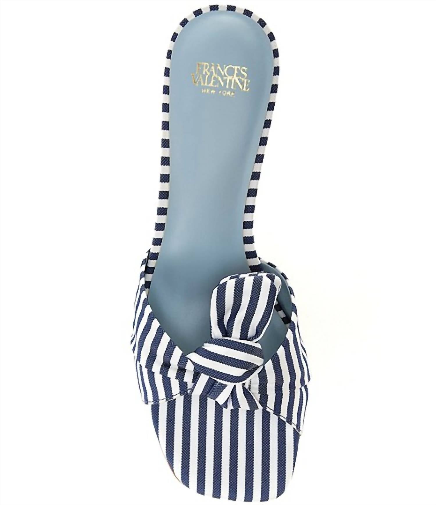 This sandal will take you from brunch to dinner and everything in between. Step into summer with the Amanda Heel Sandal by FRANCES VALENTINE, a charming embodiment of boho chic. Featuring seersucker-inspired blue and white stripes with a playful bow detail, this sandal captures the carefree spirit of vacation outings. The standout design includes a sunshine-yellow ball heel, measuring 2.5 inches for a comfortable mid-height lift. Made in Brazil, these sandals effortlessly blend style and spontaneity, making every step a celebration.