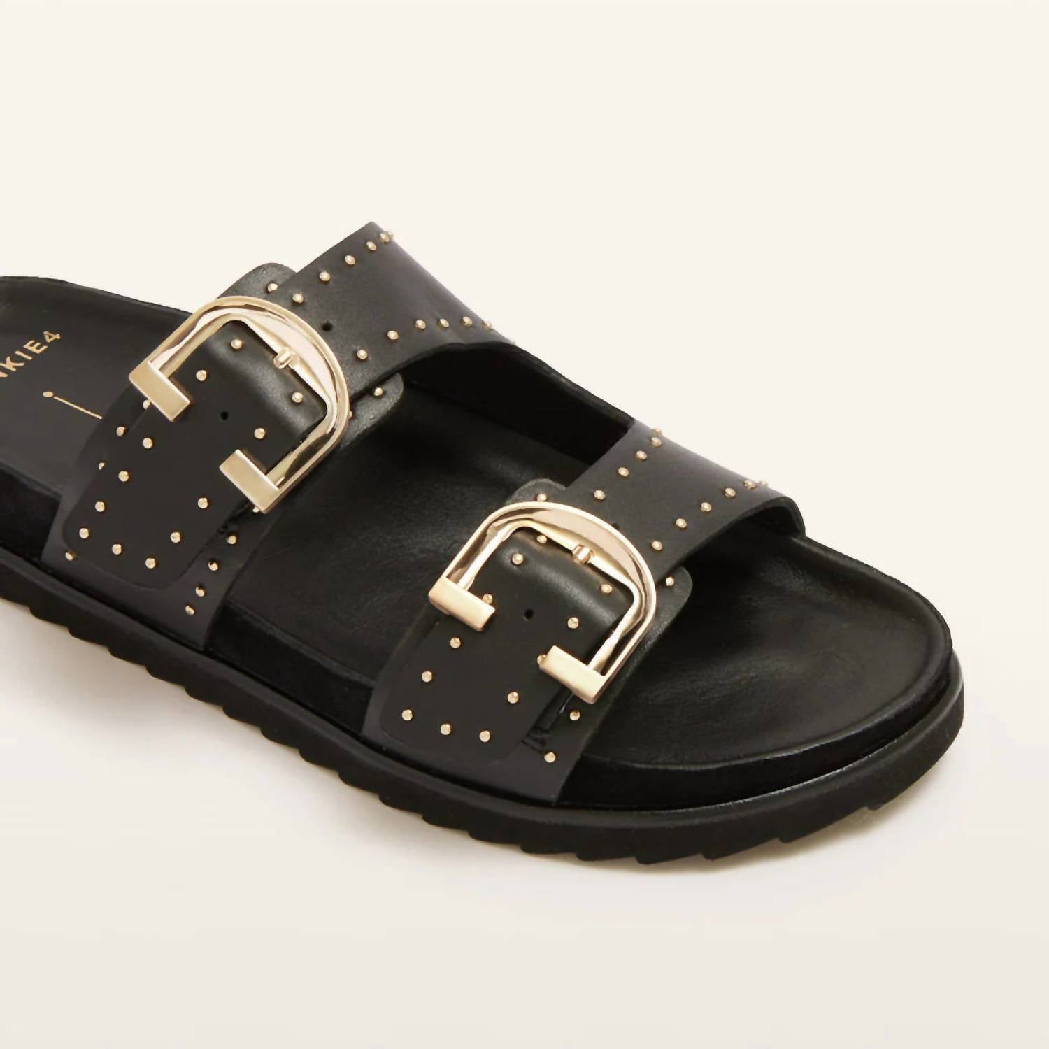 Classicly cute and all-day-wearable. We love this sandal. Embrace both fashion and function with the Women's Deon Stud Sandal by FRANKIE4. Crafted from premium leather, these sandals feature adjustable straps with striking silver stud detailing, perfect for making a stylish entrance. The Sole Hero™ Footbed provides excellent support for the heel, arch, and forefoot, while the dual-layer cushion system ensures all-day comfort. Designed with a medium width and a flat heel under 1", these round toe sandals in classic black with a chunky sawtooth sole are ideal for summer occasions and travel.
