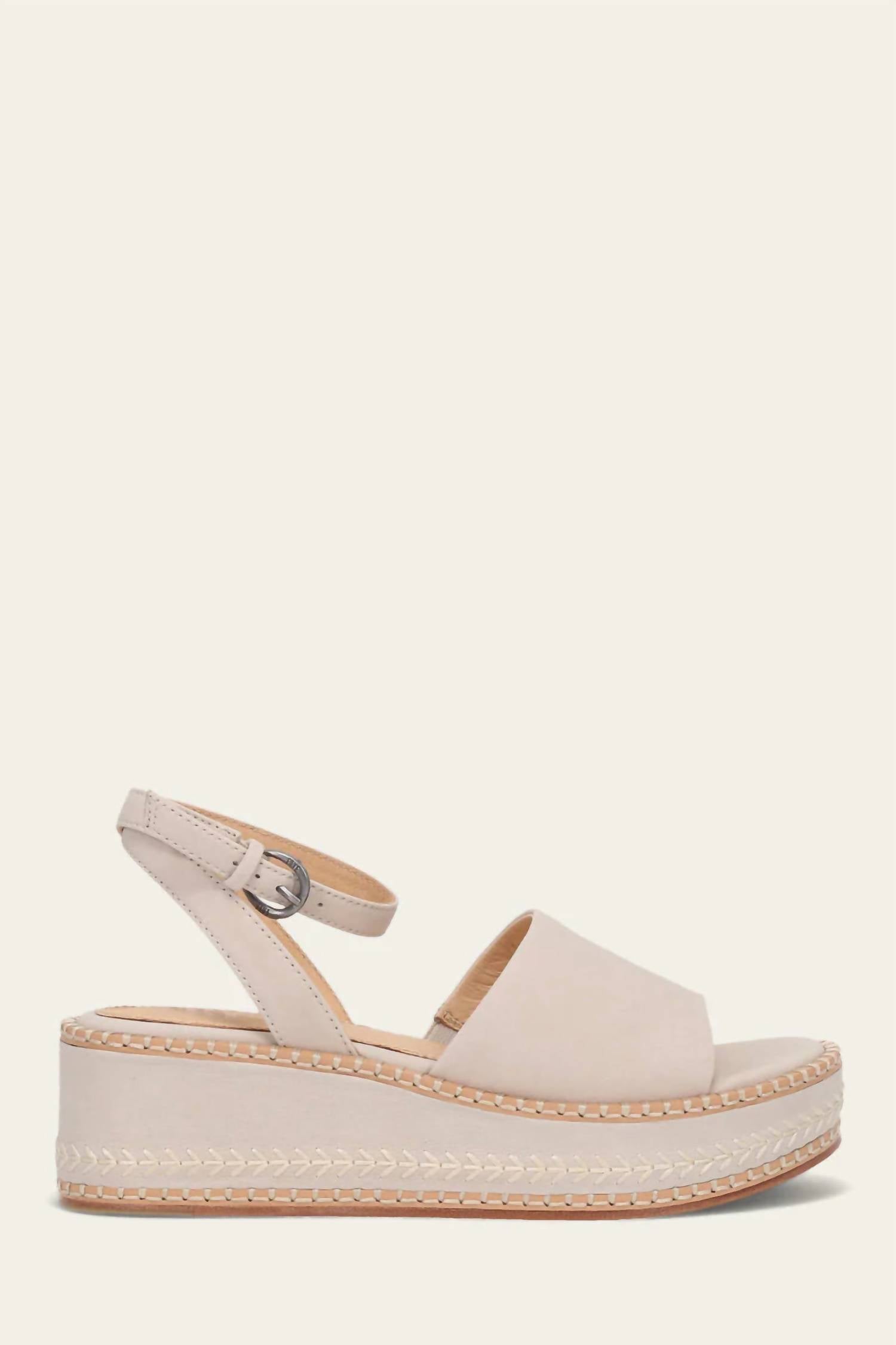 Step into effortless elegance with the Frye Women’s Joy Ankle Strap Platform Sandal in a chic ivory shade. Crafted from premium nubuck and suede leather, this sandal showcases unmatched craftsmanship with distinctive blanket and arrow stitching details. Enjoy the balance of its 1.375-inch platform and 2-inch wedge heel, while the outer buckle closure ensures a tailored fit. Lined in leather with a cushioned insole, these sandals are perfect for your next vacation or Mother's Day outing.
