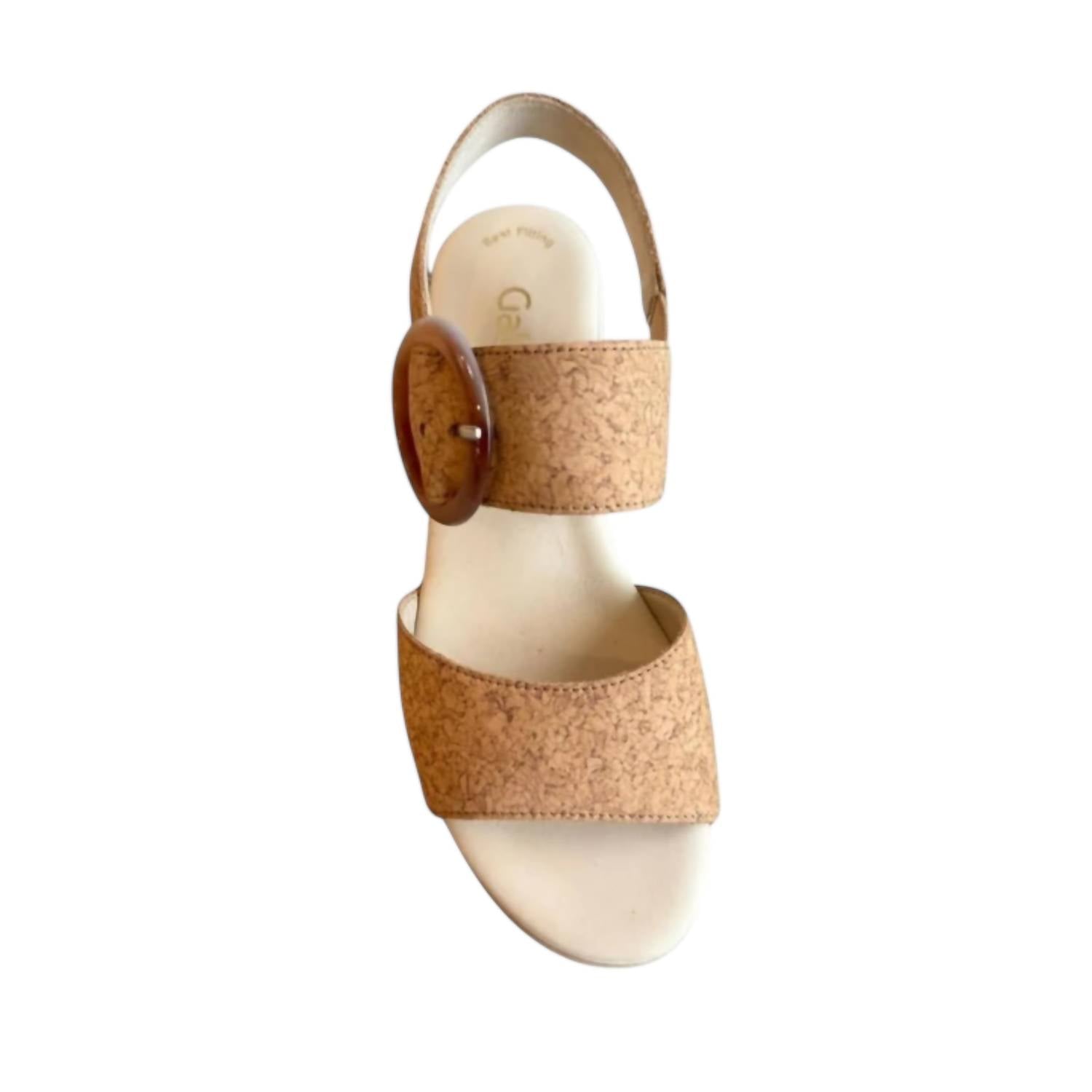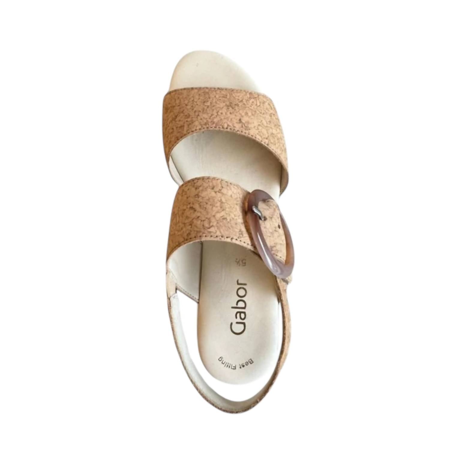 Dresses, denim, shorts... these wedges go with just about anything. Step up your style with the Women's Cork Sandals by Gabor, featuring two-tone leather straps that offer both elegance and comfort. These natural-toned wedges boast an open toe design and an adjustable buckle for a personalized fit. The innovative Hovercraft system cushions your steps with soft air chambers, while the sturdy leather lining, insole, and synthetic outsole provide lasting support. Heel Height: 2 inches; Platform Height: 1 inch; Weight: 11 oz. Imported.