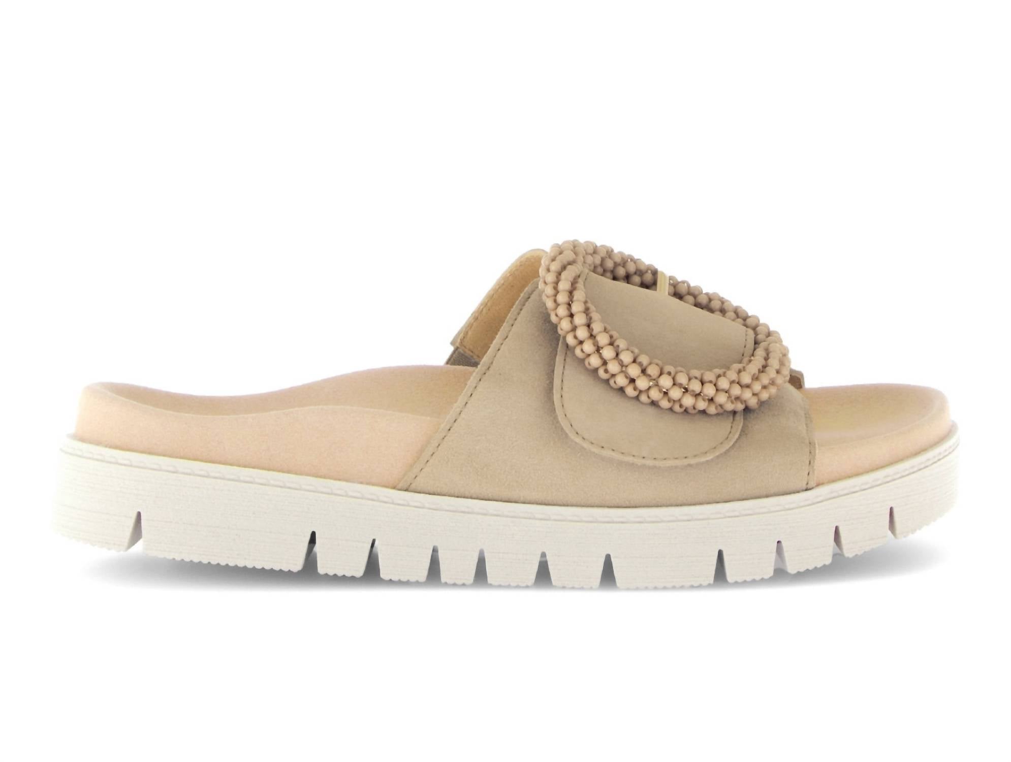 Classicly cute and all-day-wearable. We love this sandal. Step into summer style with the Women's Platform Sandal by GABOR in a sophisticated caramel shade. Crafted from luxurious suede, this sandal features an open toe design and a low 1.378-inch platform heel, ideal for adding a touch of boho chic to your vacation wardrobe. Its adjustable strap ensures a secure fit, while the camel beaded buckle embellishment offers an elegant detail. Perfect for all-day comfort and fashion, this stylish sandal is the ideal companion for your sunlit adventures.