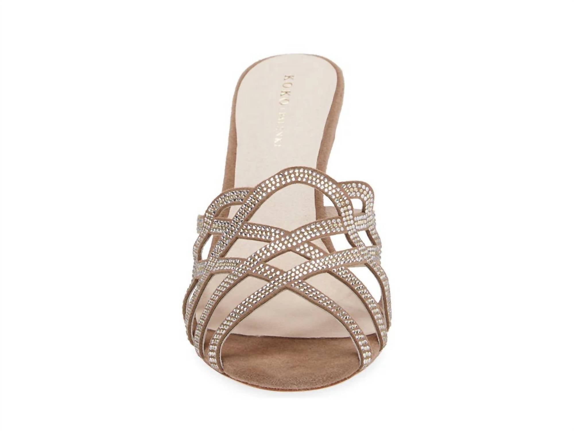 The perfect height for day to night. Perfect blend of style and comfort. Crafted from sumptuous almond suede and adorned with sparkling crystals. Feature an open toe design and sleek spool heel measuring 3 inches. Leather lining and cushioned footbed provide all-day comfort. Durable leather outsole ensures lasting wear.