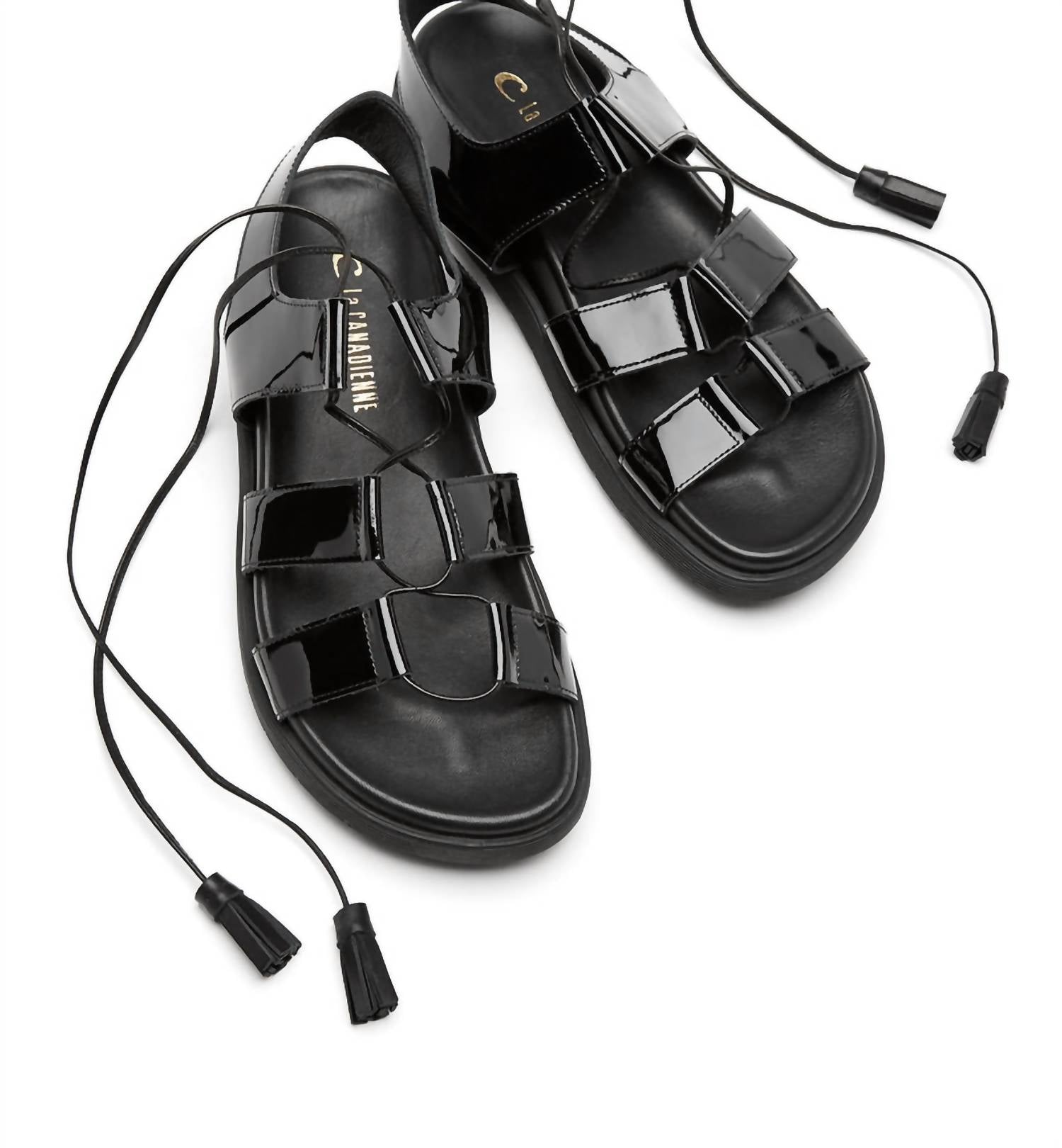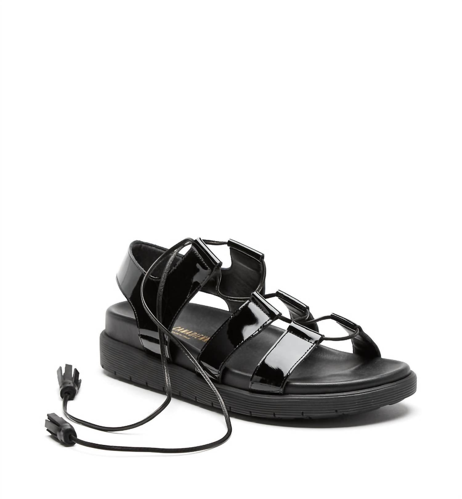 Step into comfort and style with the Women's Rambler Slip On Lace Up Slingback Sandals by La Canadienne, crafted in sleek black patent leather. These sandals feature an innovative Hovercraft rubber synthetic sole for enhanced comfort and a breathable leather lining. The open toe design is accentuated with ghilie lace details and adjustable laces, providing a personalized fit. Made in Italy, these fashionable sandals are perfect for everyday wear with their flat 1" heel height.