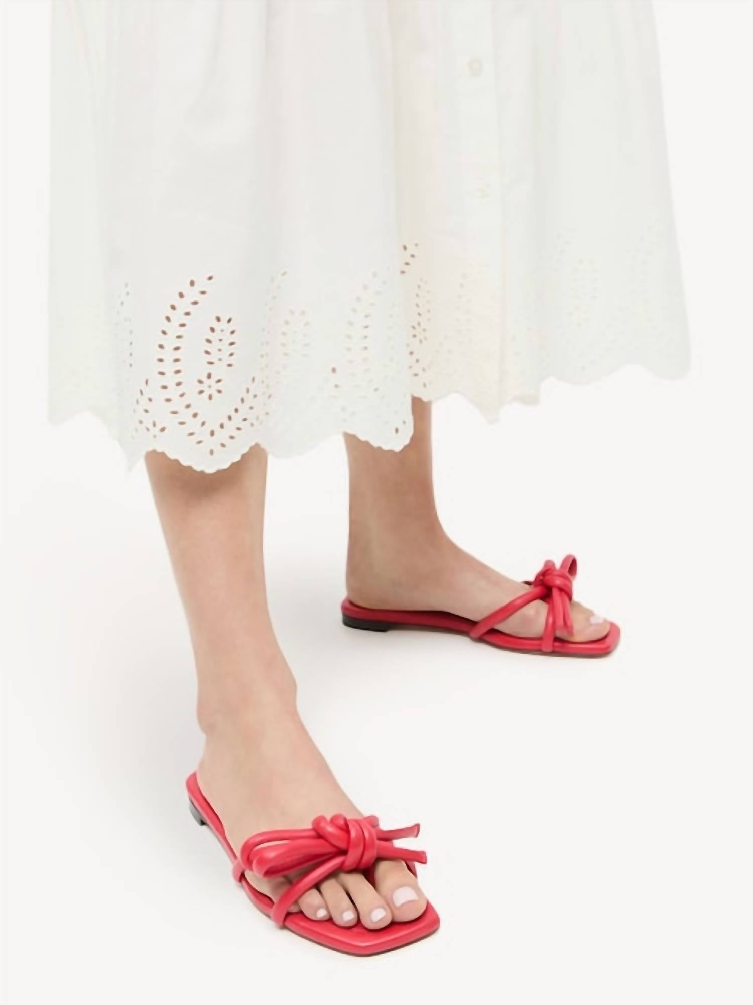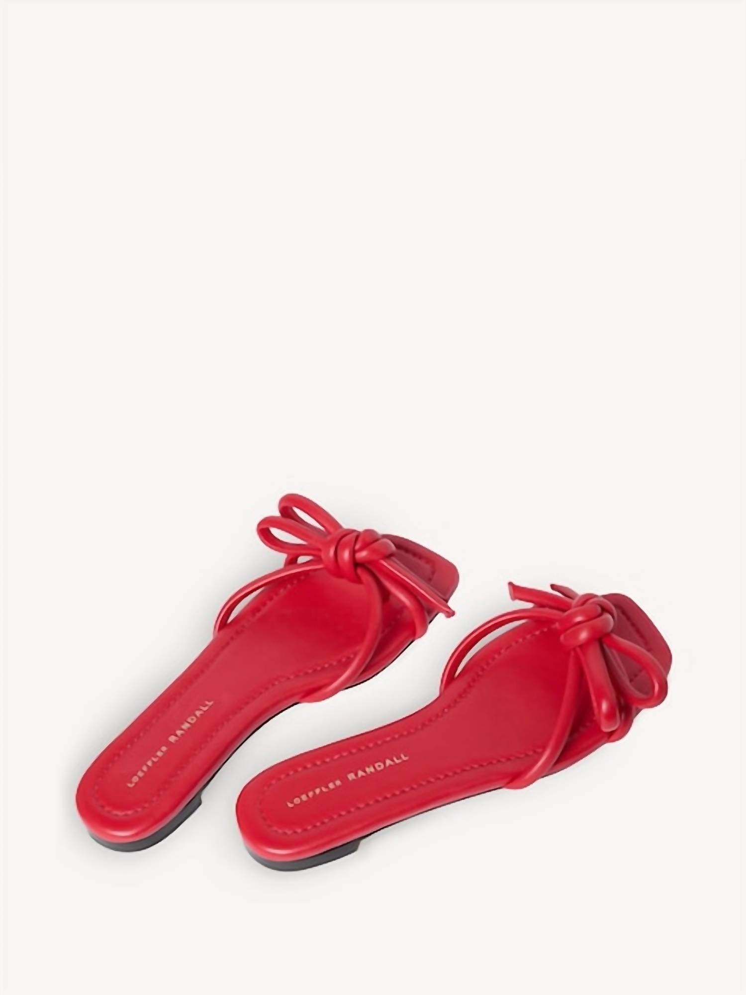 Classicly cute and all-day-wearable. We love this sandal. Step into summer style with the Women's Hadley Bow Flat Sandal by Loeffler Randall, crafted in vibrant red nappa leather. This sandal showcases a knotted bow detail, padded footbed, and tonal stitching on an open, square toe design. Made entirely from 100% leather, it offers easy slip-on convenience. Perfect for a boho chic look on your next Easter vacation.