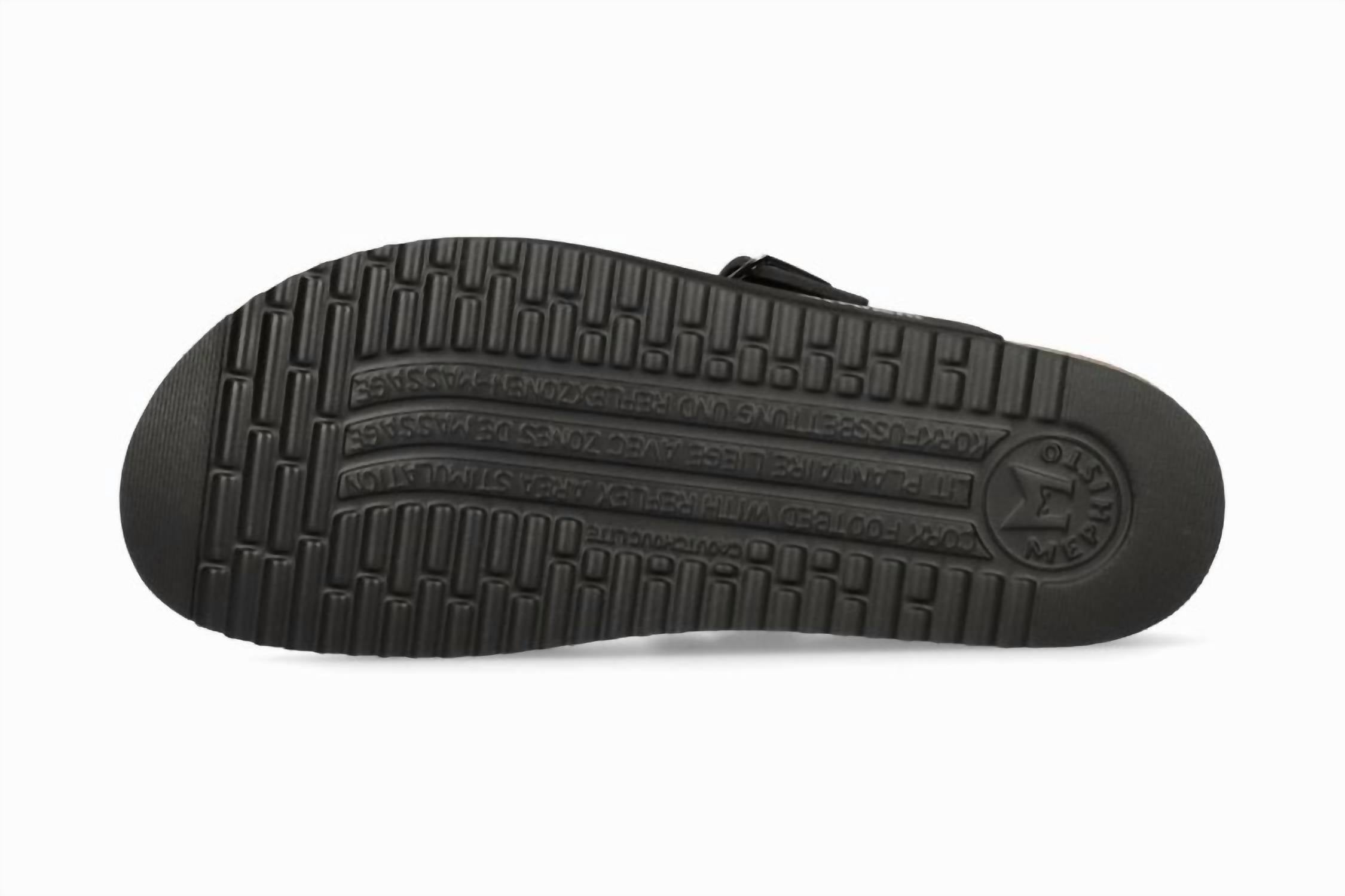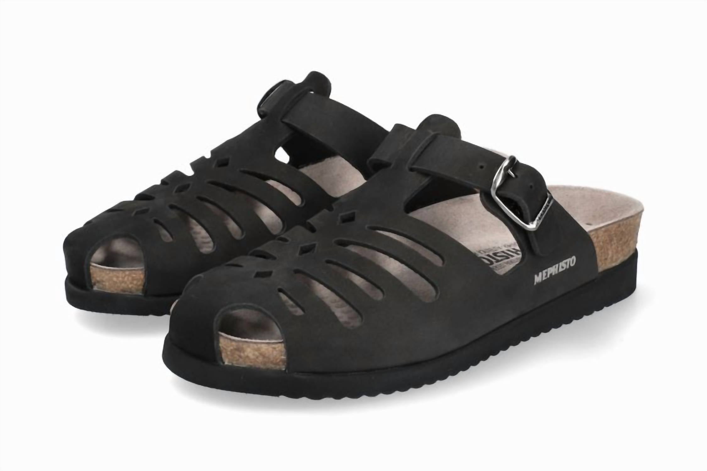 This sandal will take you from brunch to dinner and everything in between. Discover the Women's Hedina Fisherman Mule Sandal by MEPHISTO, crafted for practicality and comfort in sophisticated black leather. Its finely perforated design and innovative SOFT-AIR technology in the cork arch ensure a fatigue-free experience, while the AIR-RELAX system supports foot anatomy. Featuring an adjustable strap with buckle fastening, this sandal embraces your foot with standard width and a flat heel. Perfect for daily wear, it provides ease and support without compromising on style.