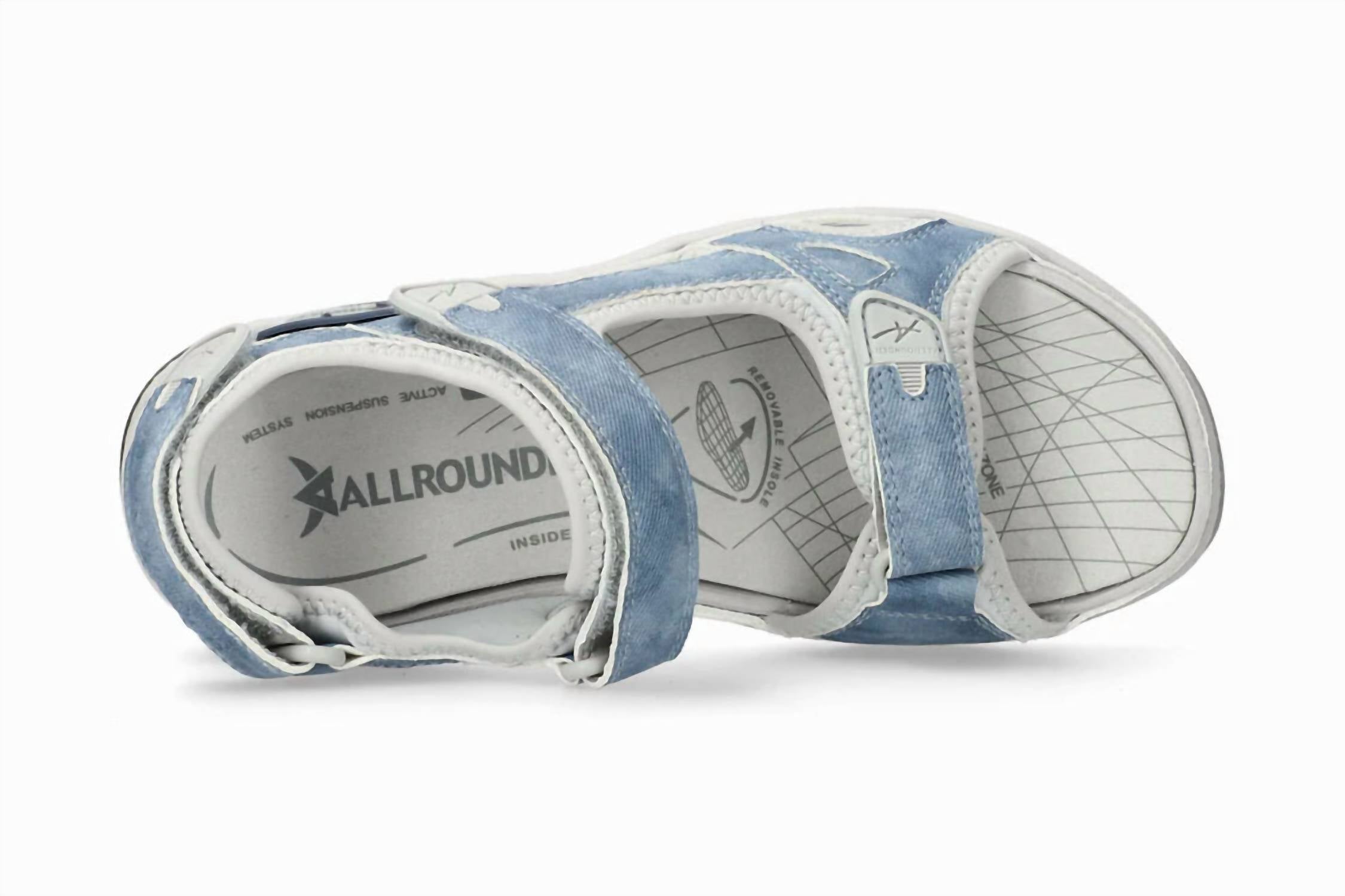 Introducing the Women's Westside Sandal by MEPHISTO, crafted for exceptional comfort and versatility. Made from faux leather in a stylish Jeans Blue Tumbled color, this sandal is perfect for both leisure and adventure activities. Its patent-pending SHOCK ABSORBER technology reduces strain on joints, while the self-gripping strap ensures a personalized fit. Designed with an open-toe, flat chunky heel, these summer sandals provide excellent grip, making them ideal for hiking and outdoor use.