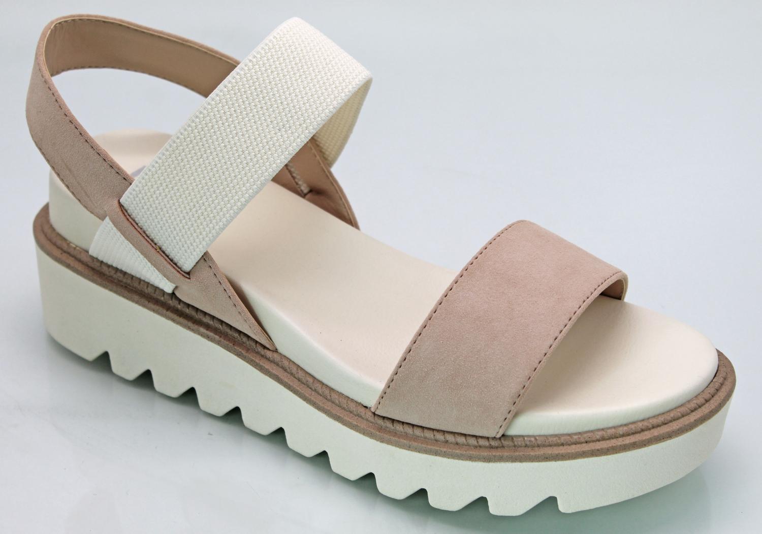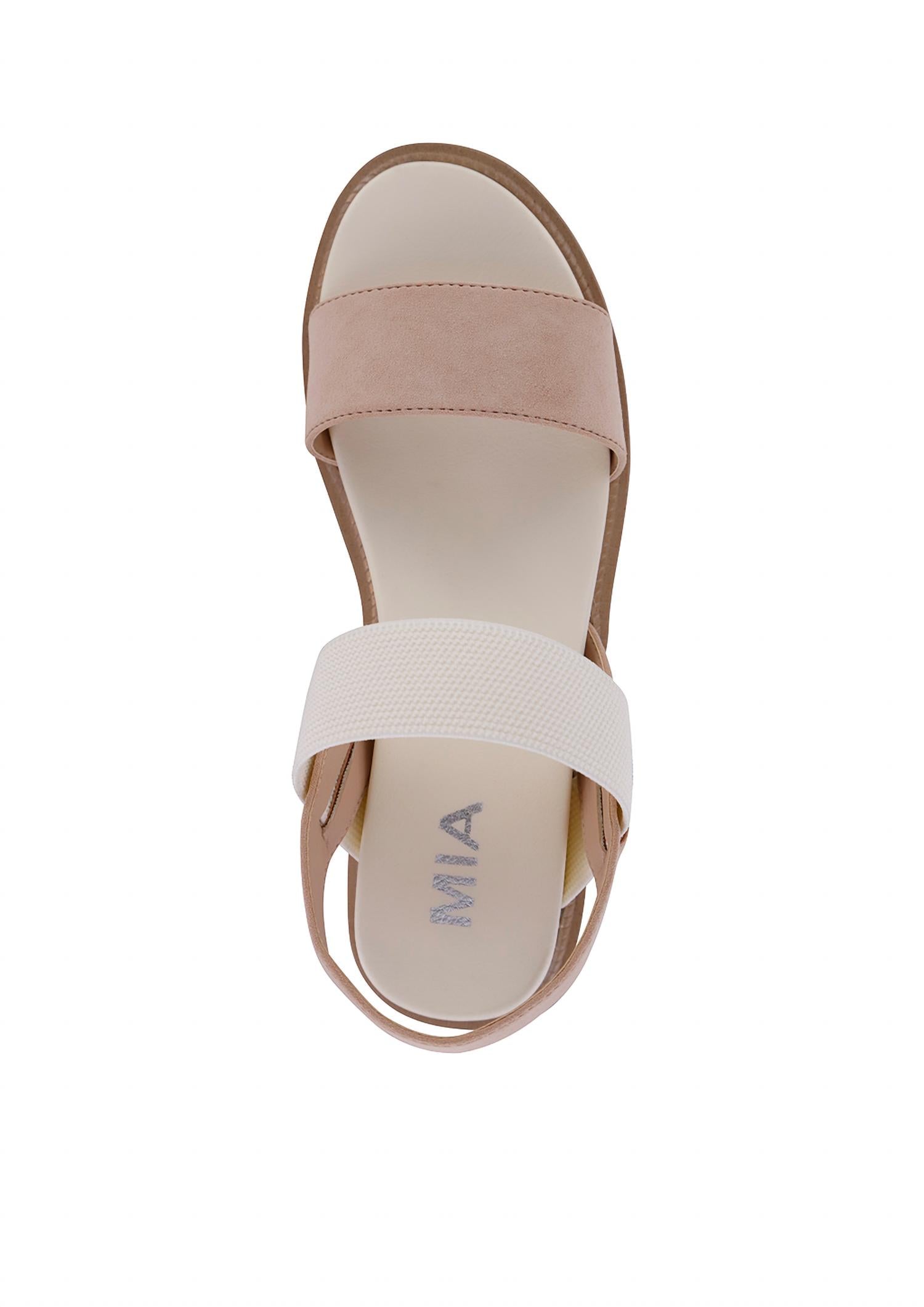 Classicly cute and all-day-wearable. We love this sandal. Step confidently into summer with the MIA Women's Jene Sneaker Bottom Sandal, an ideal choice for any minimalist wardrobe. These blush and white sandals feature asymmetrical elastic straps for a secure yet stylish fit, complemented by a single vegan leather strap across the vamp. The sandal boasts a flat heel style with an open toe design, perfect for a casual church outing or Mother's Day celebration. Finished with a signature contoured footbed and a 1.6-inch ridged platform sneaker bottom, these sandals provide both comfort and a touch of flair.