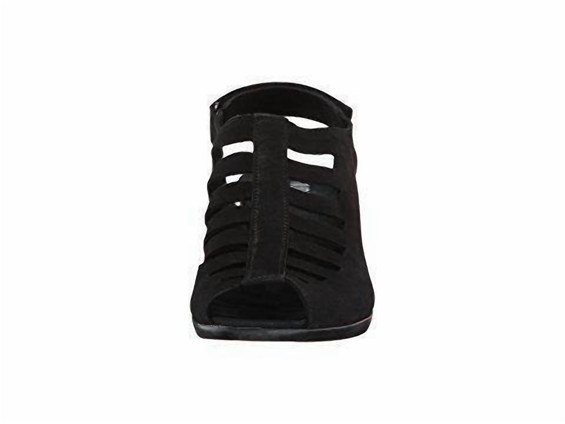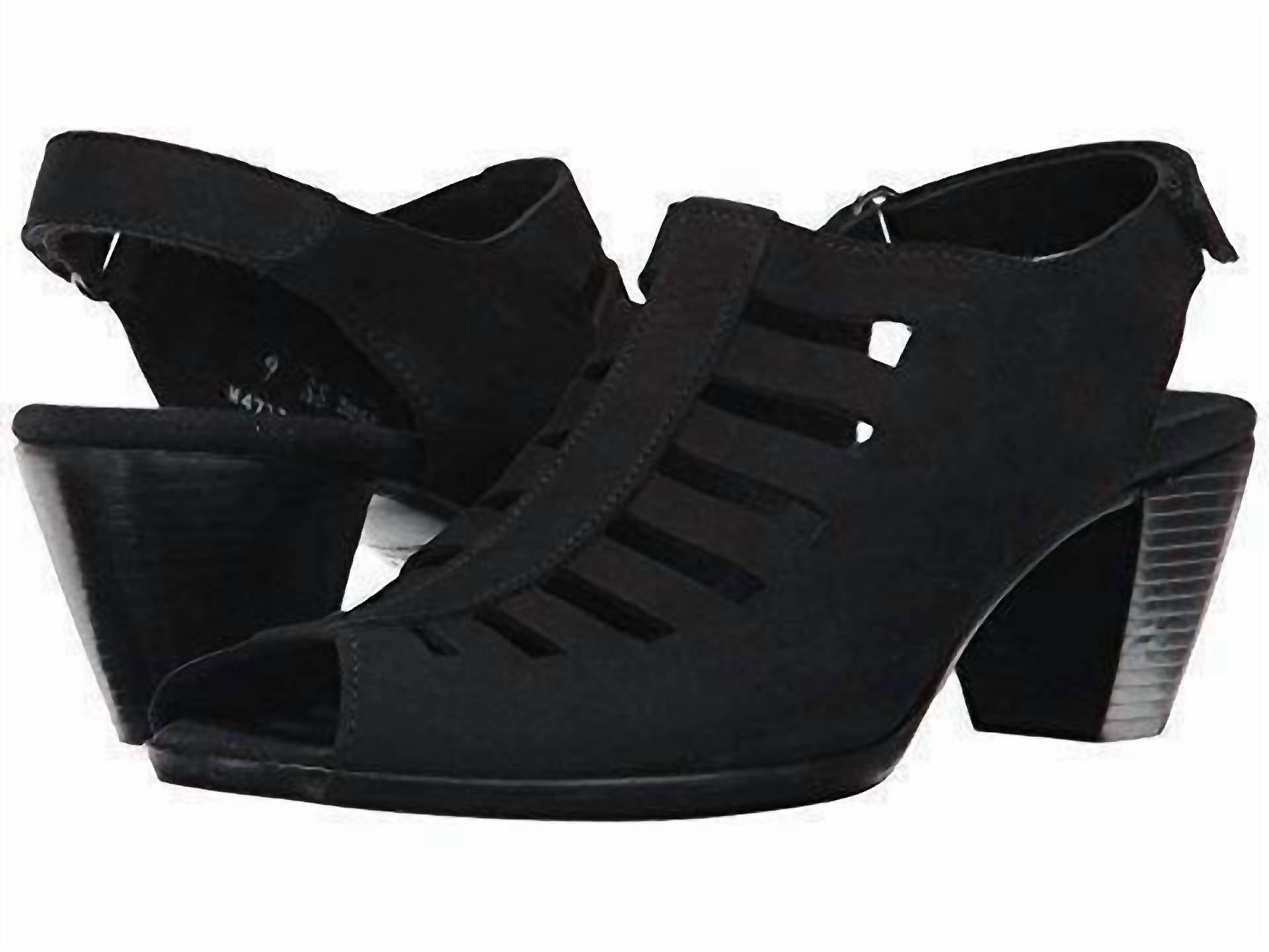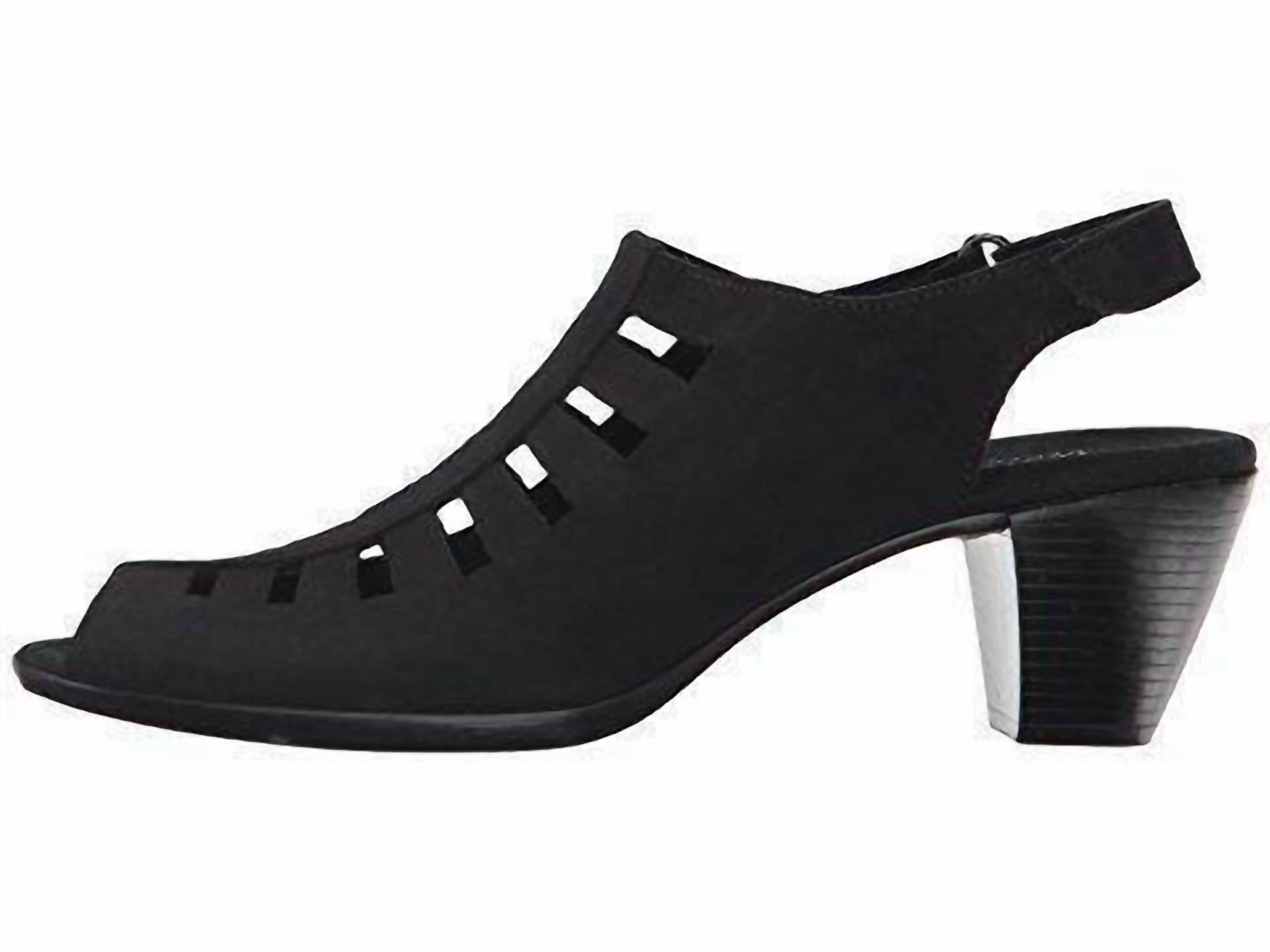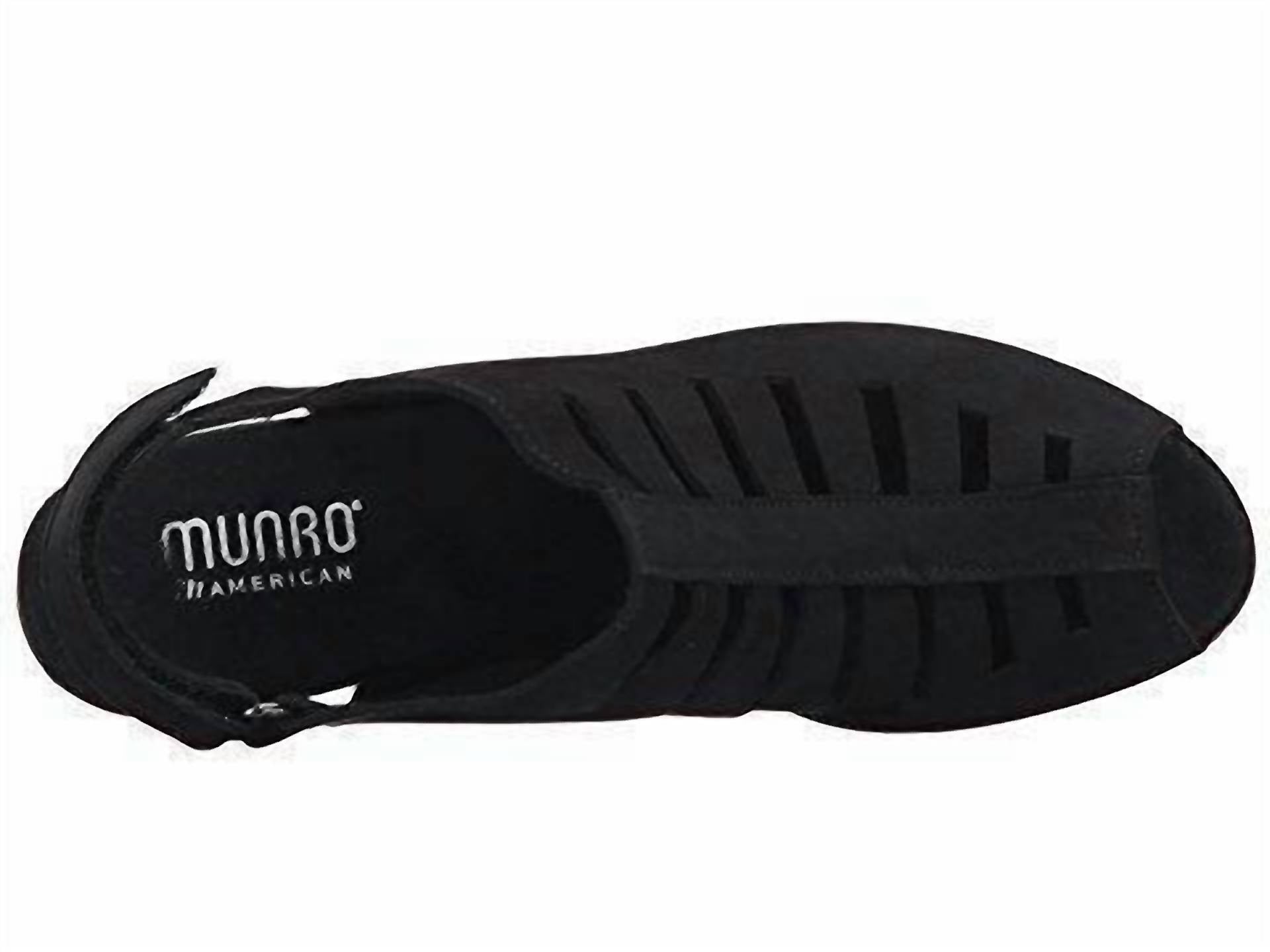 Experience style and comfort with the Munro American Abby Nubuck Slingback Sandal, a perfect choice for dinner parties or Mother's Day celebrations. This block heel sandal boasts a variety of leather uppers in classic black, featuring a peep toe design and an adjustable hook-and-loop closure for a custom fit. Inside, a soft textile lining and a molded insole with a PORON® flex zone ensure all-day comfort, supported by a riveted steel shank for stability. Its durable rubber outsole promises long-lasting wear, making it ideal for the fall season and aligning with the quiet luxury trend.