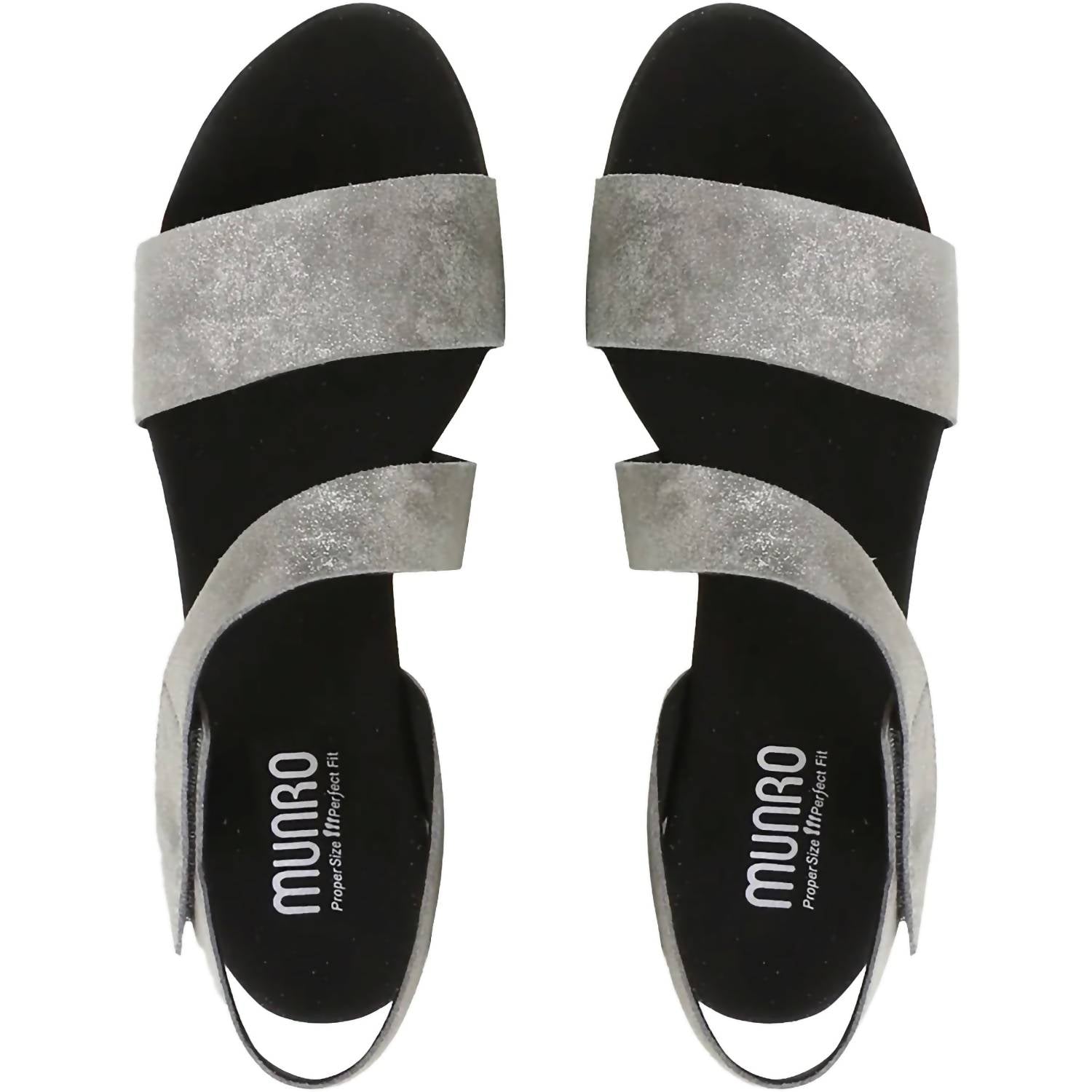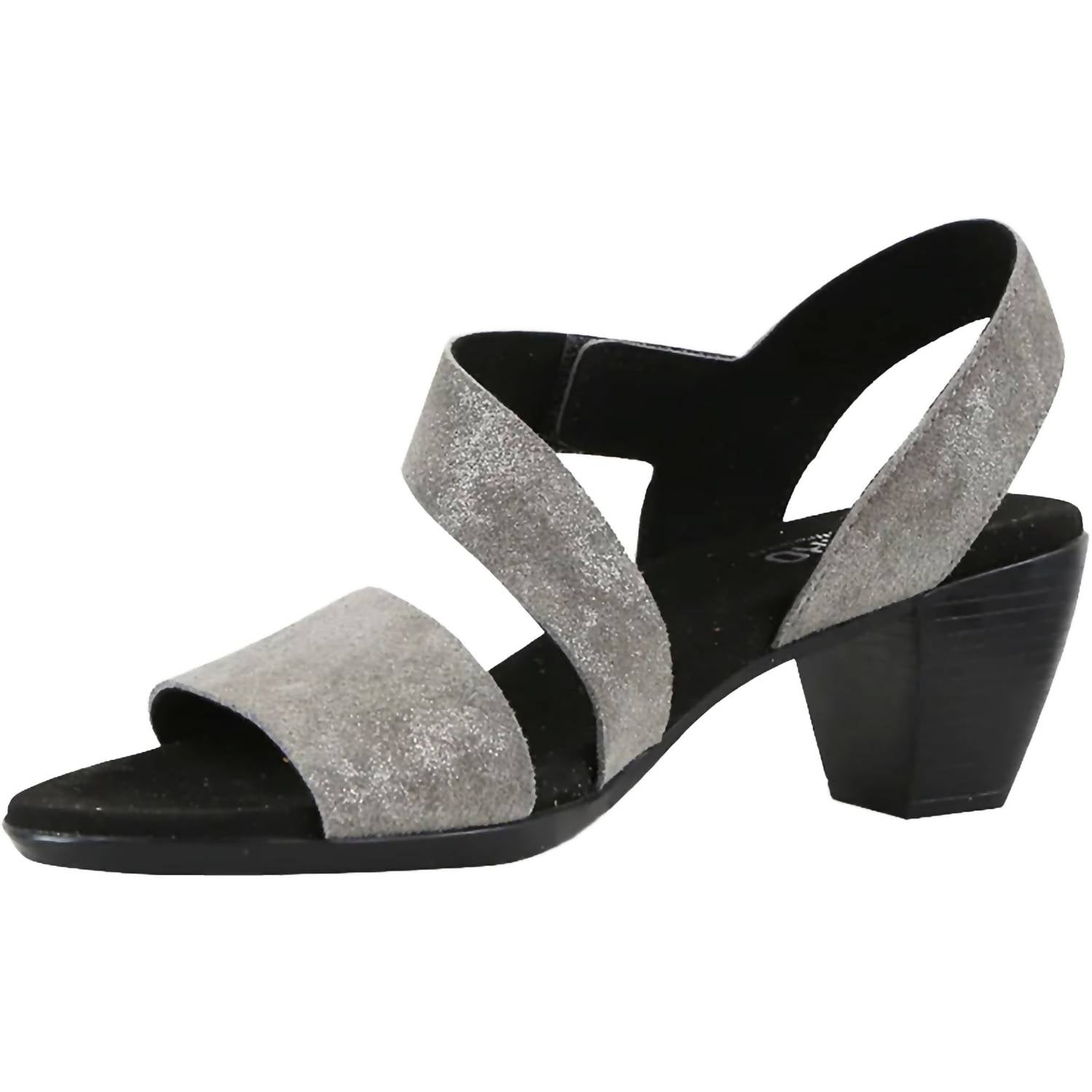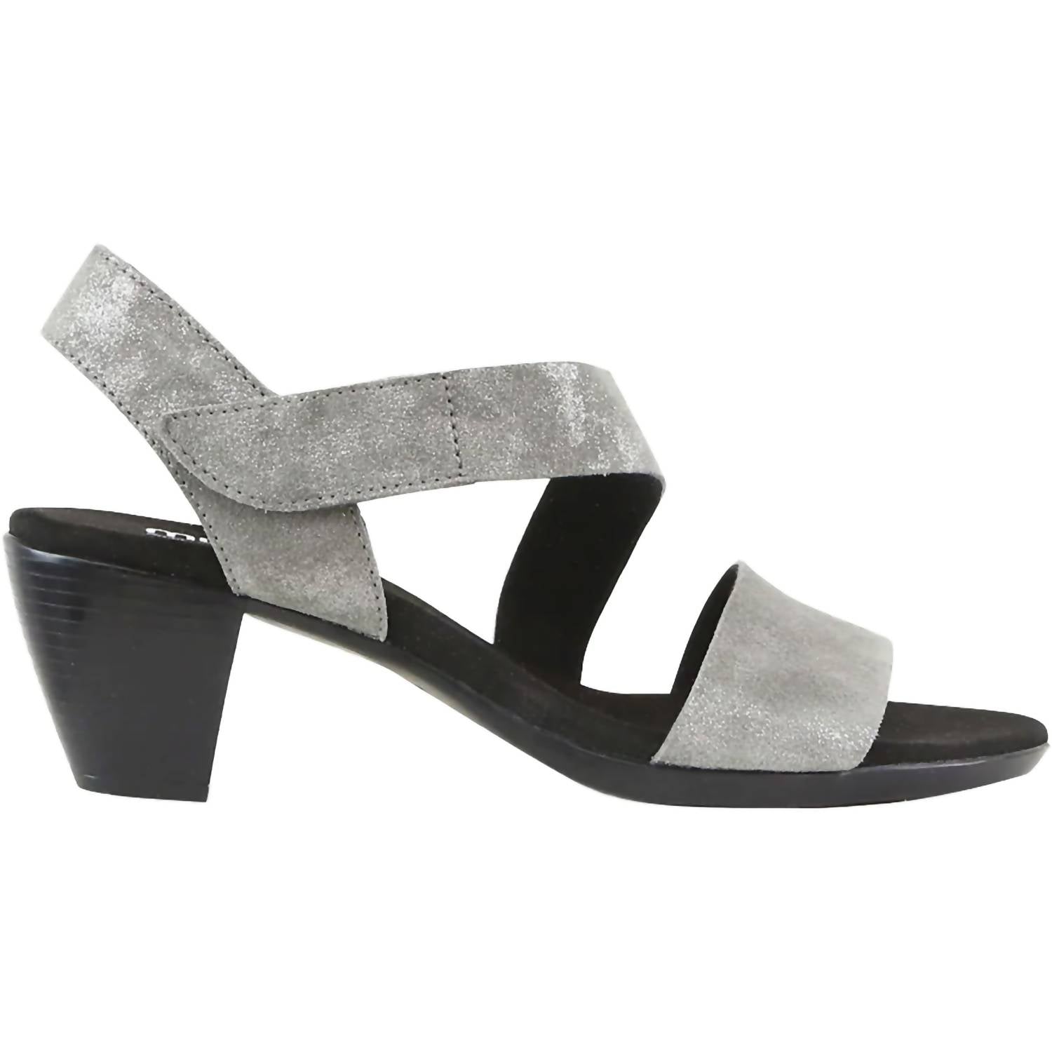 Don't be deceived, these heels are comfy as can be. Elevate your evening look with the Munro Women's Lucia Gunmetal Metallic Suede Heels Sandal. These stylish sandals feature a nubuck upper with a microfiber lining, perfect for a dressy occasion. They are designed with a low block heel measuring 1.75 inches, and an adjustable hook and loop closure for a customized fit. The microsuede wrapped contoured footbed and riveted steel shank offer exceptional support and comfort, complemented by a shock-absorbent, flexible natural latex rubber outsole.