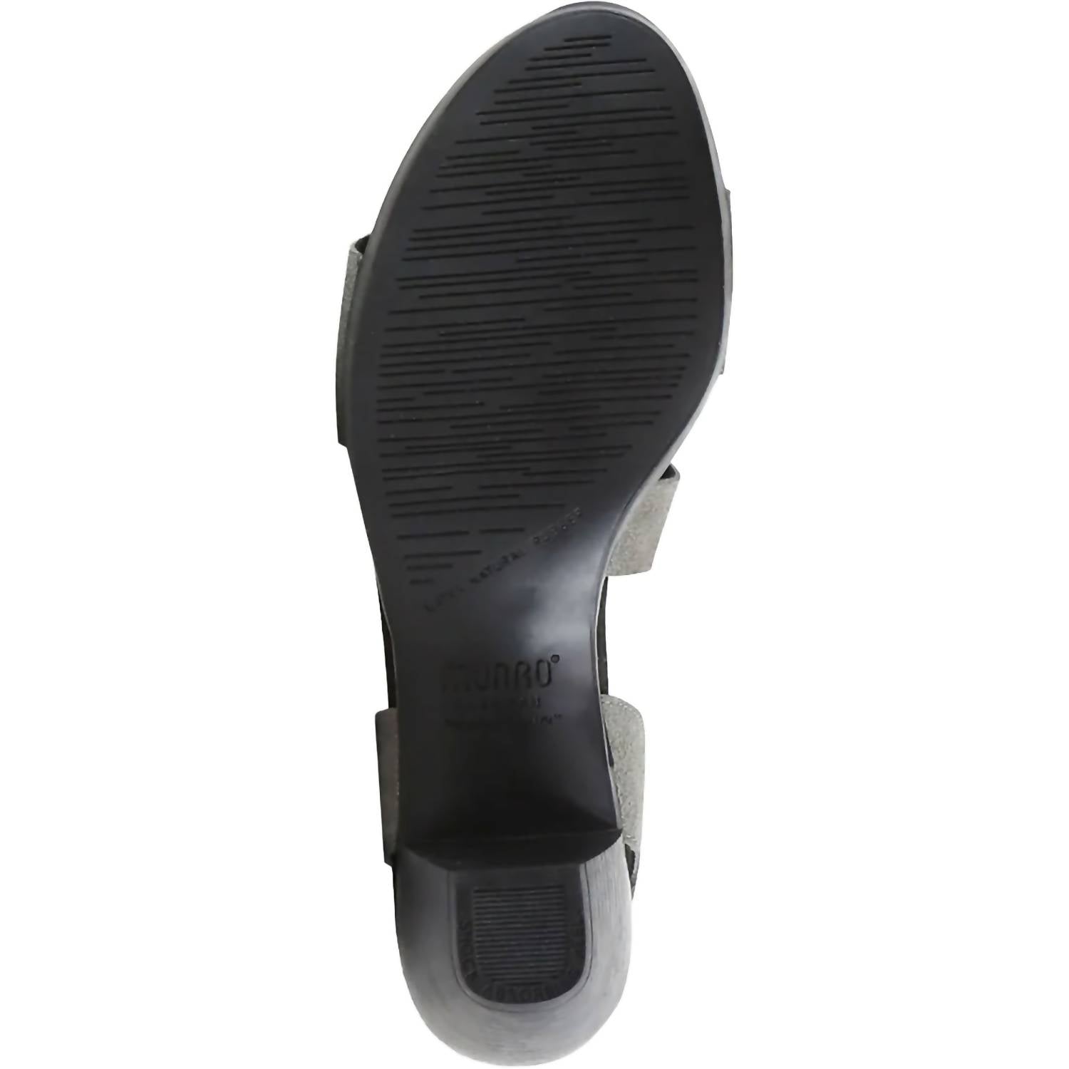 Elevate your evening look with the Munro Women's Lucia Gunmetal Metallic Suede Heels Sandal. These stylish sandals feature a nubuck upper with a microfiber lining, perfect for a dressy occasion. They are designed with a low block heel measuring 1.75 inches, and an adjustable hook and loop closure for a customized fit. The microsuede wrapped contoured footbed and riveted steel shank offer exceptional support and comfort, complemented by a shock-absorbent, flexible natural latex rubber outsole.