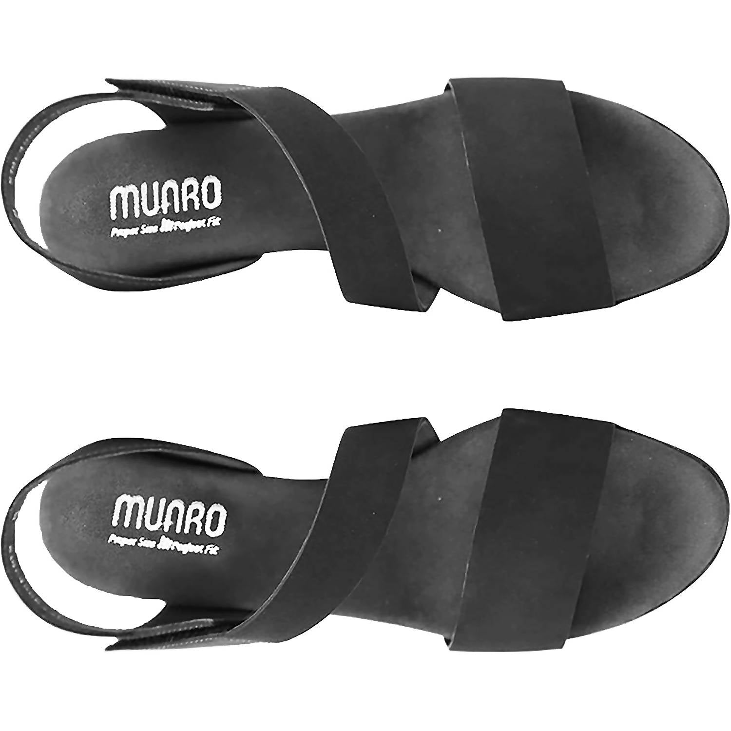 This sandal will take you from brunch to dinner and everything in between. Step out in style with the Munro Women's Lucia Nubuck Leather High Heel Ankle Strap Sandal, perfect for cocktail parties or a chic Thanksgiving gathering. These sandals feature a 1.75" block heel for a subtle lift and an open toe design for a Y2k trend look. Made from black nubuck, they boast a hook and loop closure for a secure fit and a microsuede wrapped, shock absorbent contoured footbed for added comfort and support. The natural latex rubber outsole ensures flexibility and durability, making these sandals a sophisticated choice for your spring wardrobe.