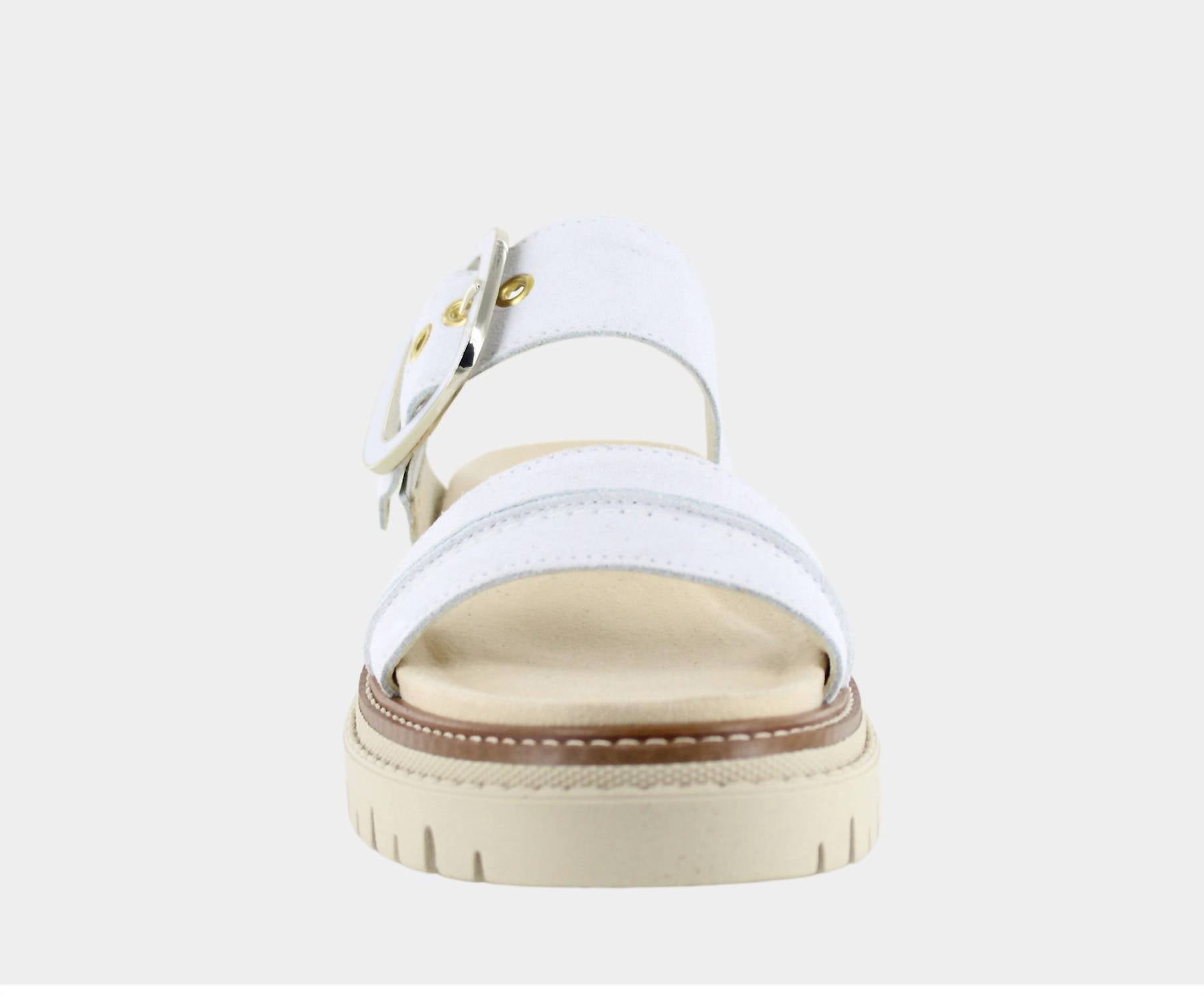 Flowy dresses, cropped pants, and even jumpsuits... this sandal works with them all! Introducing the Women's Mulberry Sandal by NAOT, a chic addition to your spring wardrobe in a classic white hue. Crafted from 100% high-quality leather, this sandal features an open toe and a comfortable sole for all-day wear, perfect for vacation or workwear occasions. Its easy slip-on style makes it an ideal choice for effortlessly chic casual days. Embrace the blend of comfort and style with this trendy sandal, designed for the modern woman.