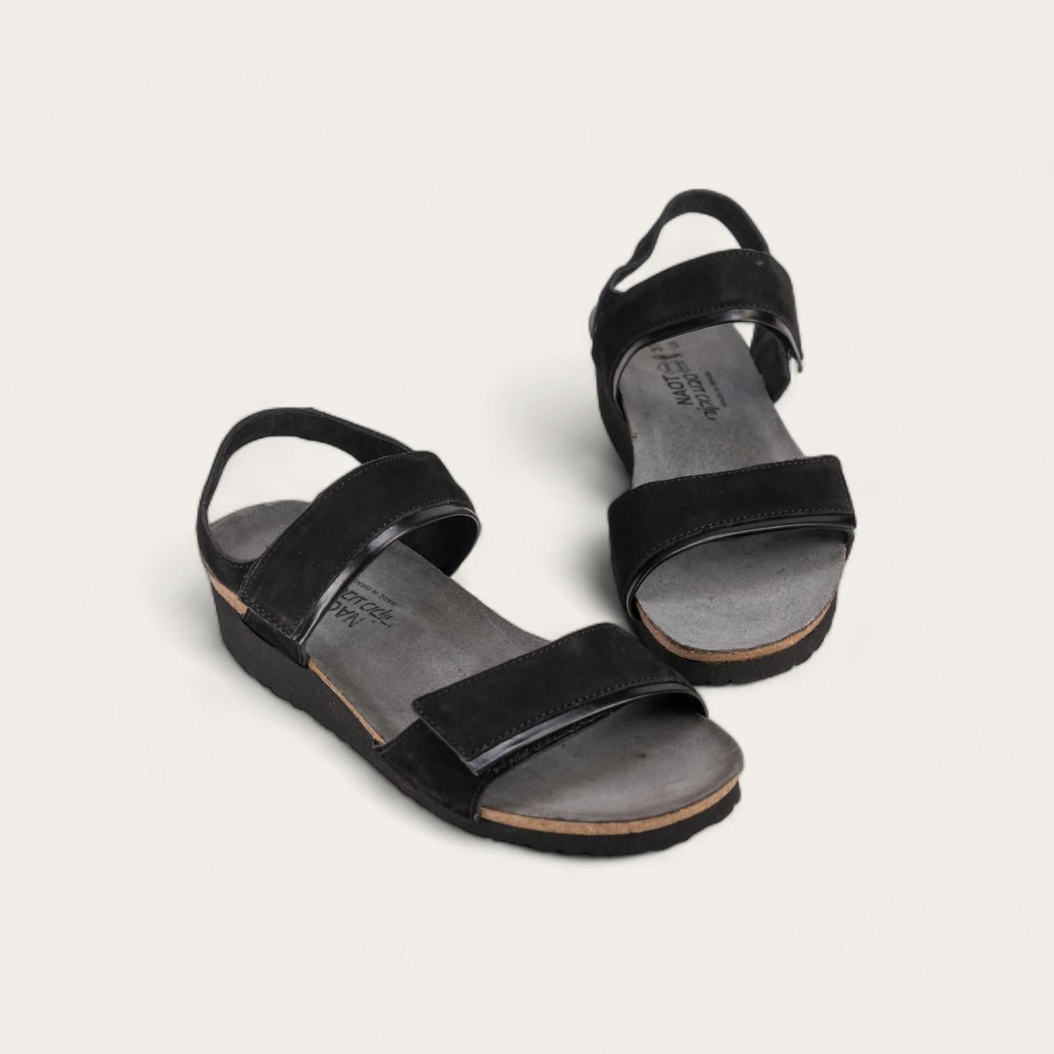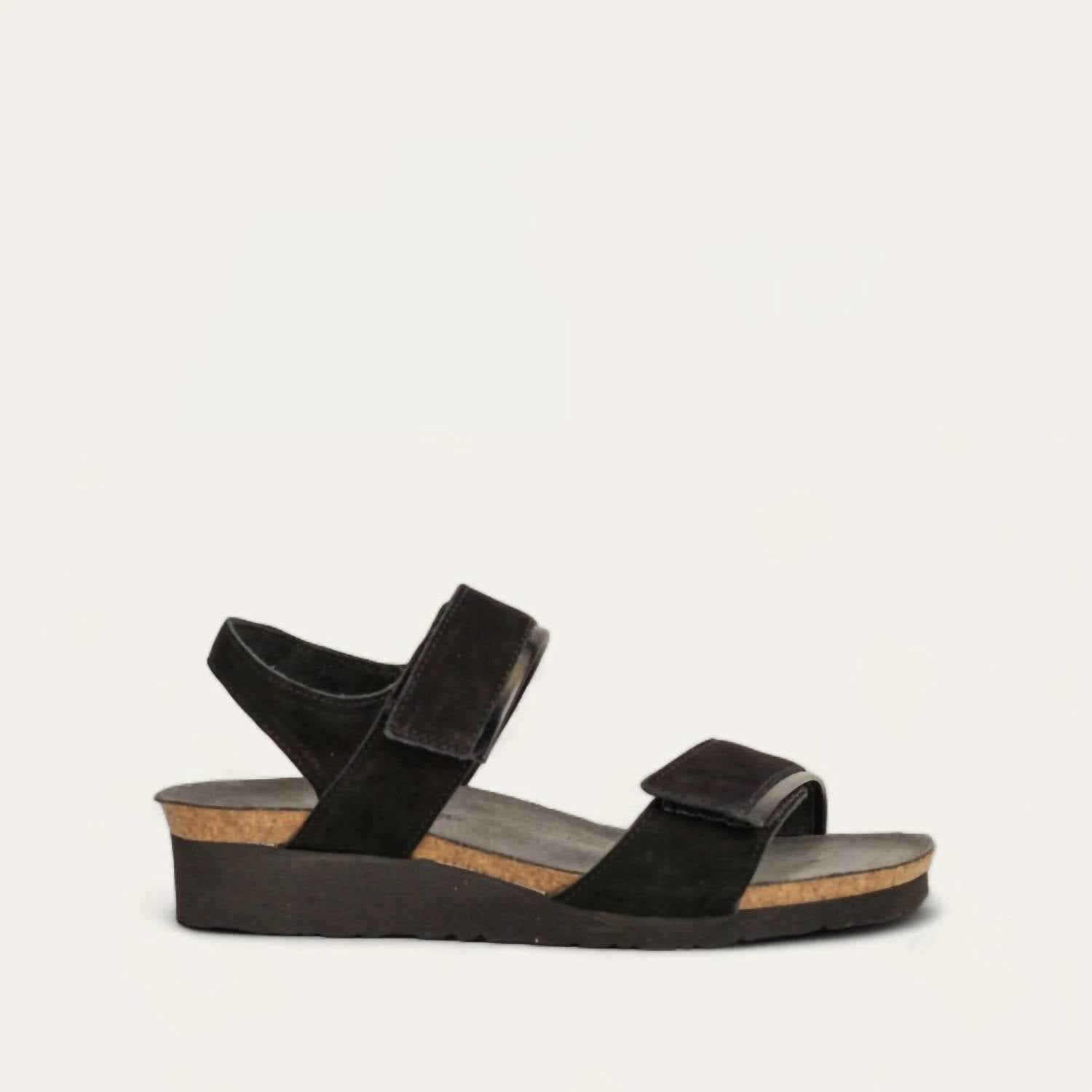 The Aisha sandal features contrasting leather details on both straps for a stylish, edgy look. Hook-and-loop closures provide an adjustable, comfortable fit, while the full-coverage design delivers excellent support. The anatomic cork and latex footbed, wrapped in soft suede, molds to your foot over time for lasting comfort.