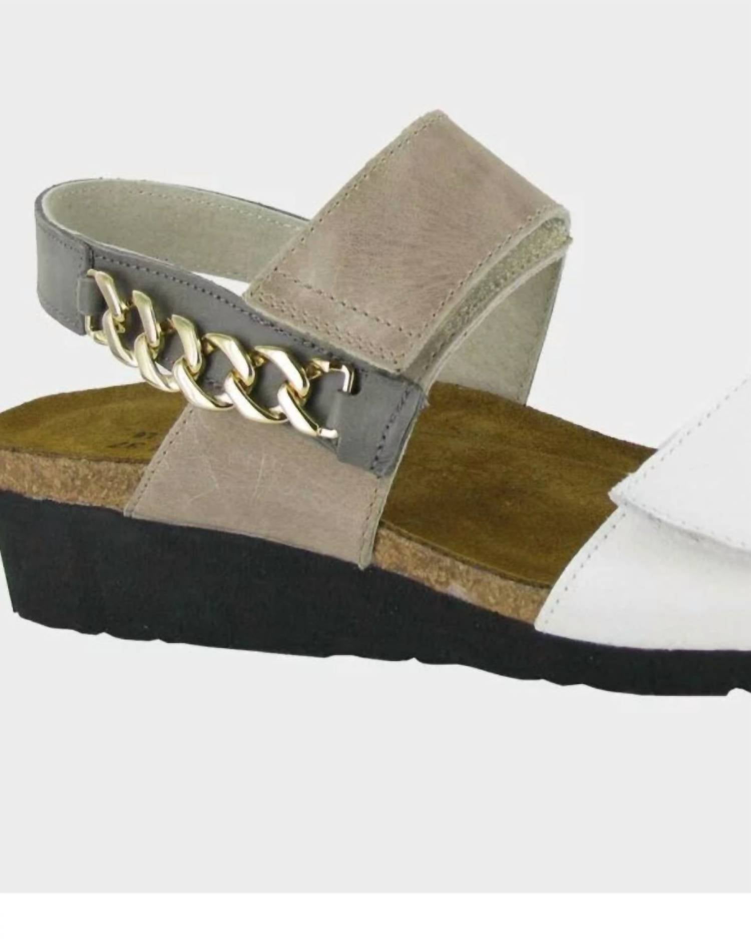 Introducing the Women's Eliana Slingback Sandal by NAOT, crafted in smooth leather with striking curb chain hardware and available in bold White Khaki Beige hues. Designed with double hook and loop straps, this sandal offers convenience and ease of wear. The anatomic cork and latex footbed, wrapped in pampering suede, adapts to your foot for personalized comfort. With a 1.5" heel and a narrow to medium width, these sandals are APMA accepted for promoting good foot health, though not slip-resistant or orthotic friendly.