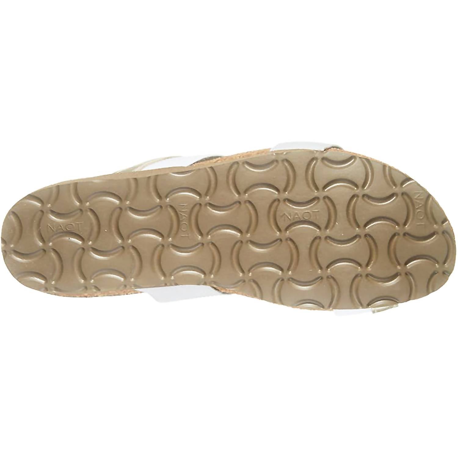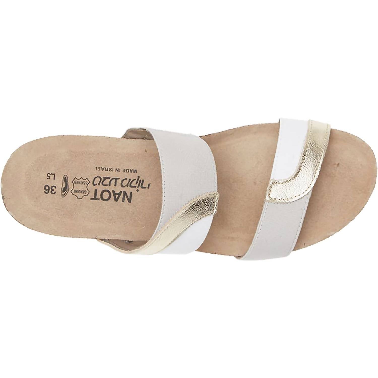 Classicly cute and all-day-wearable. We love this sandal. Step out in style and comfort with the Women's Frankie Leather Sandals by NAOT, a boho chic essential in Radiant Gold/Ice Grey. Crafted from leather and featuring an elastic upper, these sandals boast a 1.5" EVA wedge heel for a subtle lift. The anatomic cork and latex footbed, wrapped in suede, conforms to your foot shape, delivering unparalleled comfort with each wear. Perfect for a casual summer vacation, these sandals offer a medium width fit and feature padded technical lining for moisture absorption and enhanced all-day comfort.