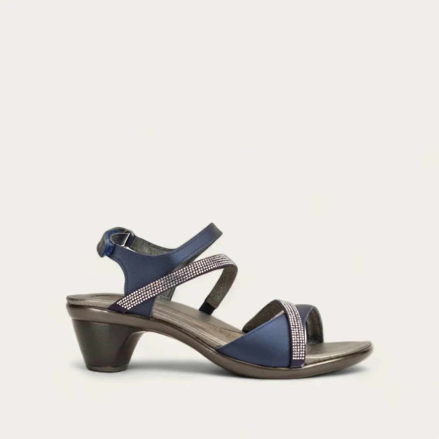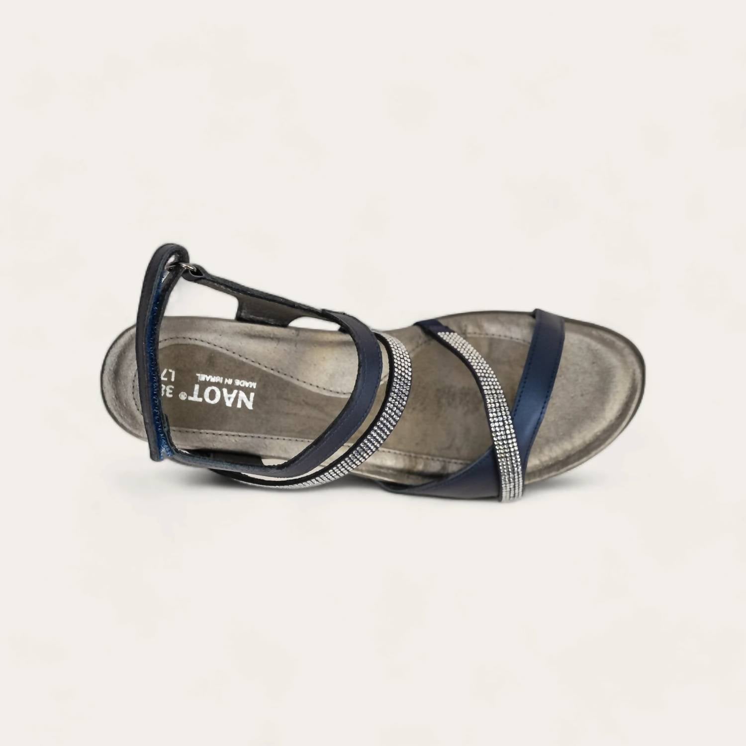 Introducing the Women's Innovate Sandals by NAOT, crafted in sophisticated navy leather for your festive events. These sandals feature a convenient hook & loop backstrap with a gore at the middle straps for a customized fit, complemented by a padded front strap for superior comfort. Adorned with feminine rhinestone accents, the Innovate Sandals stand out with their chic design and an anatomic cork & latex footbed wrapped in leather to mold perfectly to your foot. With a 2" heel made to offer height without discomfort, these sandals feature a Thermoplastic Rubber sole and are designed to be true to size, offering a medium width fit.