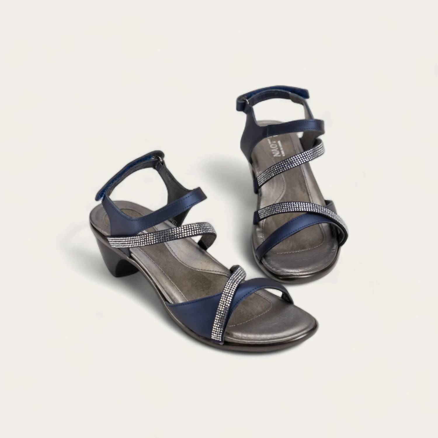 The perfect height for day to night. Introducing the Women's Innovate Sandals by NAOT, crafted in sophisticated navy leather for your festive events. These sandals feature a convenient hook & loop backstrap with a gore at the middle straps for a customized fit, complemented by a padded front strap for superior comfort. Adorned with feminine rhinestone accents, the Innovate Sandals stand out with their chic design and an anatomic cork & latex footbed wrapped in leather to mold perfectly to your foot. With a 2" heel made to offer height without discomfort, these sandals feature a Thermoplastic Rubber sole and are designed to be true to size, offering a medium width fit.