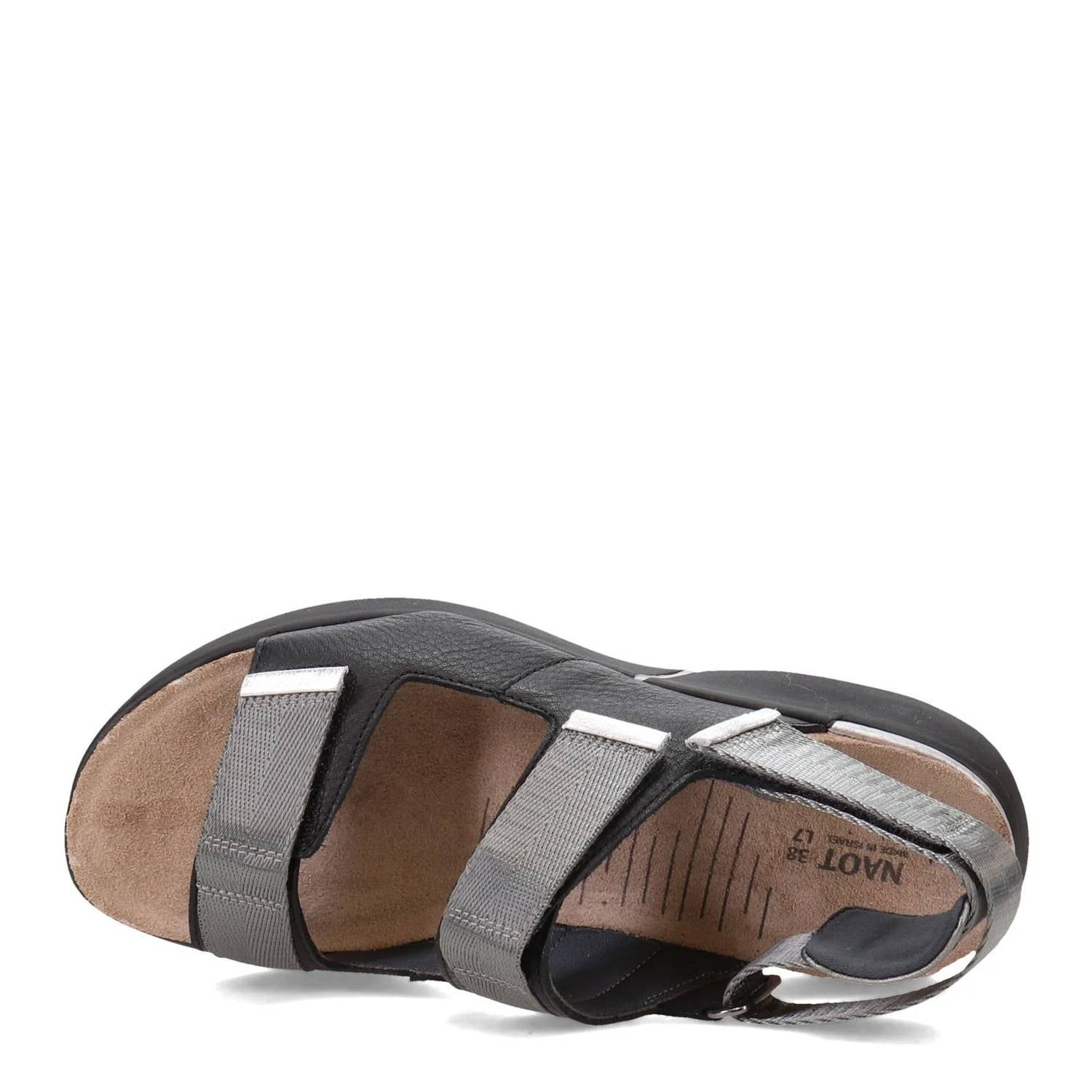 Step into effortless style with the NAOT Women's Odyssey Sandal, crafted for both comfort and elegance. This sandal in Soft Black/Silver features adjustable hook & loop straps and an open toe design for a custom fit. With uppers made from soft leather and a lightweight 1.5" rubber sole, it offers perfect arch support and true-to-size fit, recommending half sizes go up. The anatomic cork & latex footbed, wrapped in suede, molds to the foot for personalized comfort over time.