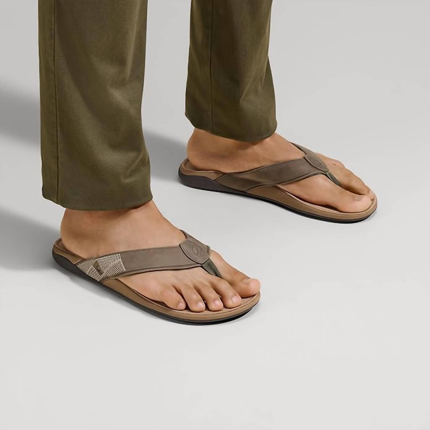 Introducing the Men's Waterproof Leather Sandals by OluKai, crafted for unrivaled comfort and style. Featuring a slip-on design, these sandals sport a 100% leather composition with a durable rubber sole and waterproof full-grain leather outer, perfect for beach activities and water sports. The sandals include a soft stretch mesh lining and a comfortable nylon toe post to ensure supreme all-day comfort. Ideal for summer athleisure trends, these sandals make an excellent choice for your next beach day outing.