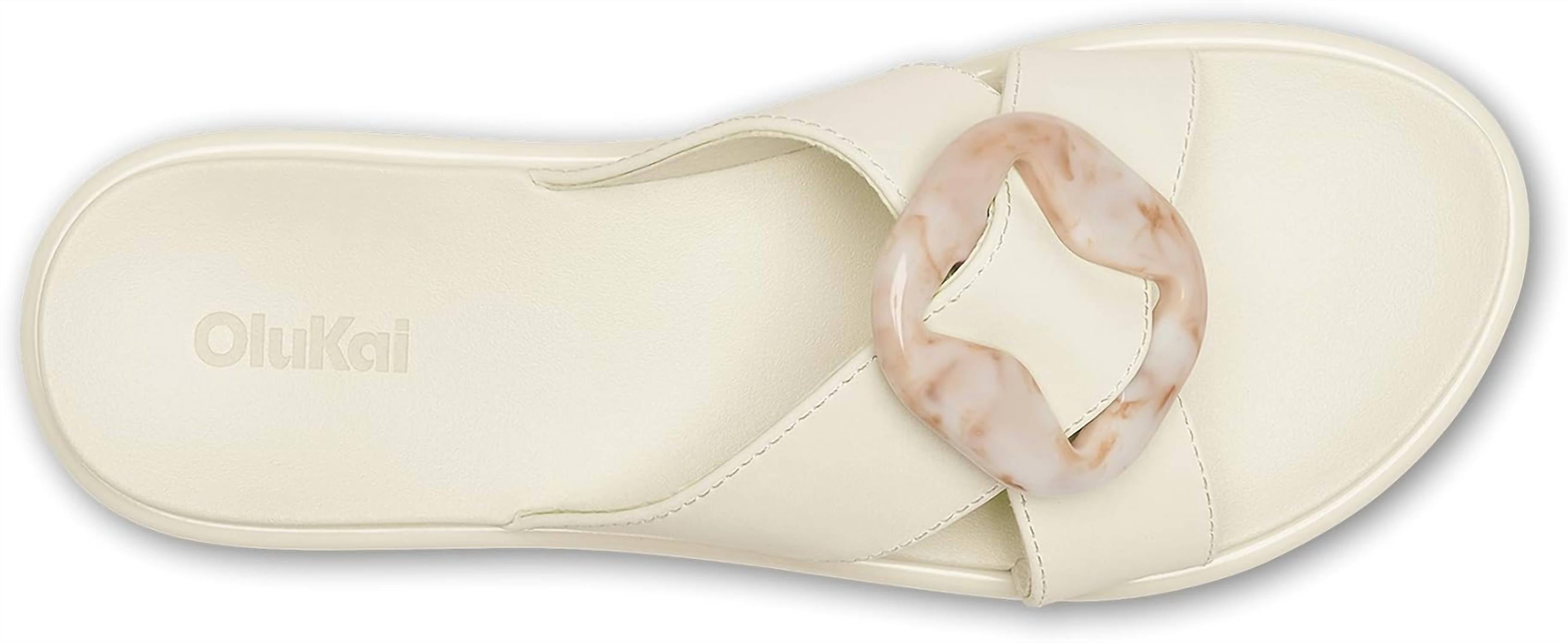 A preppy yet feminine take on the classic loafer. Discover the Women's La'i Slide Beach Sandal by OluKai, a sophisticated choice for beach days that seamlessly transition from day to night. Embrace long-lasting comfort with its slip-on design, crafted with a water-friendly synthetic rubber outer and a supportive PU midsole, perfect for your summer adventures. With a round toe shape and the non-marking Wet Grip Rubber sole, it offers unparalleled traction. Whether by the pool or in the city, the elegant crisscross straps with stylish buckle details ensure you step out in style.